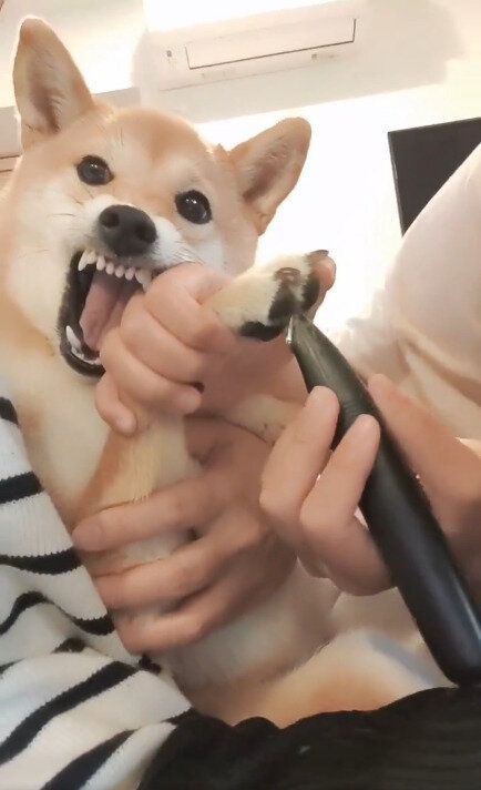 カットをするために蘭ちゃんの手をつかんだ飼い主さんの手の甲には、口を大きく開けた蘭ちゃんの犬歯が当たっています。