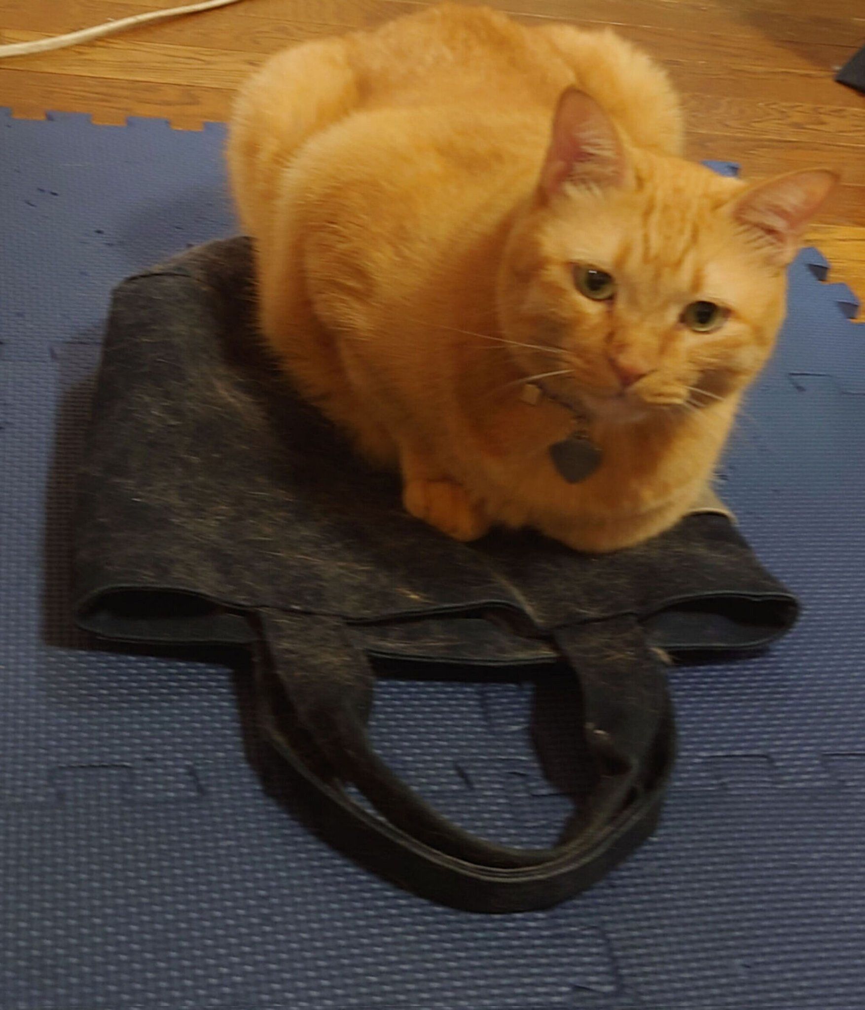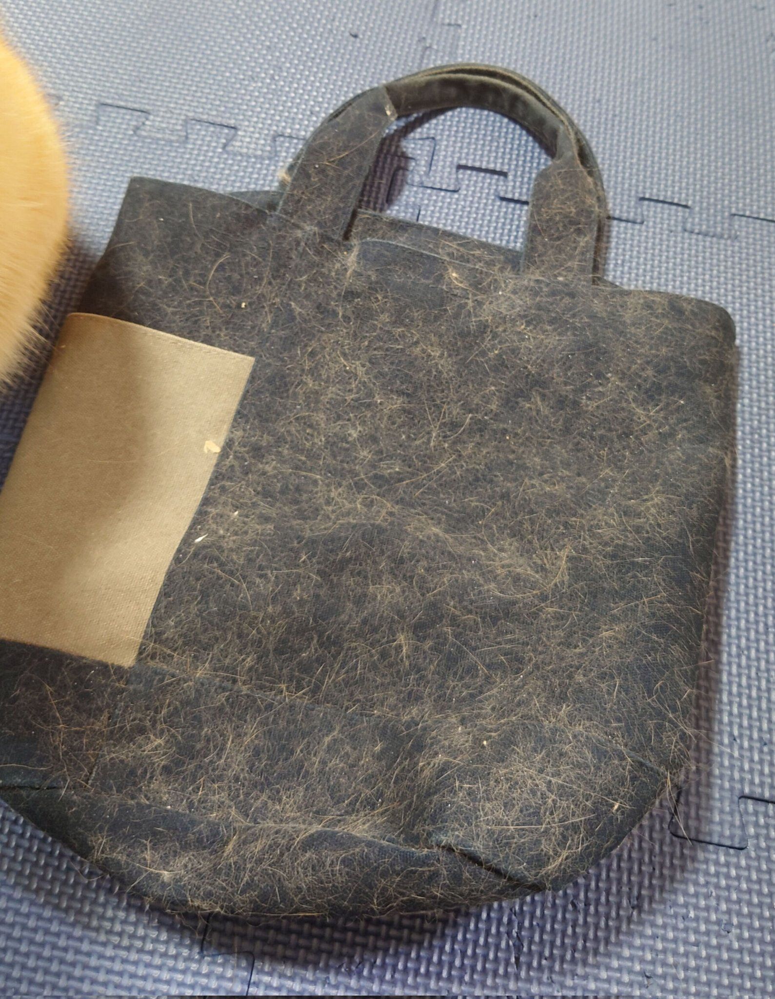 夫のトートバッグの上にちょこんと座り、くつろいでいる様子のそむちゃん。