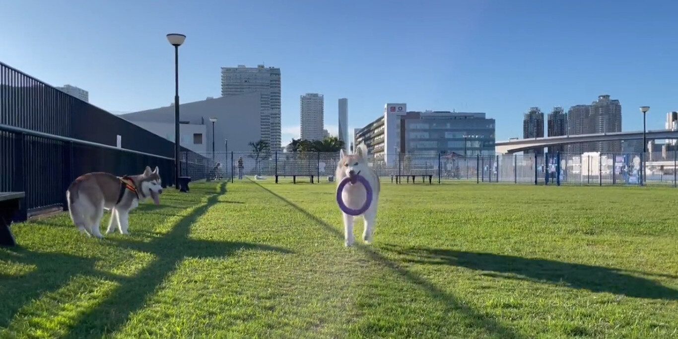「ドッグランでプラー(”もってこい”や”引っ張りっこ”などができるリング状のおもちゃ)を投げて遊んでいました」