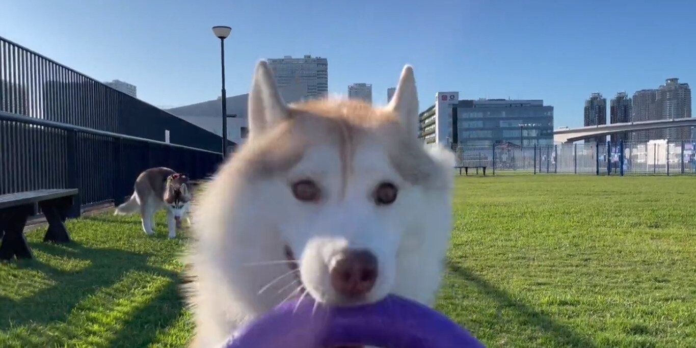 画面中央、遠くの方でリング状のおもちゃをくわえているのはココちゃん。撮影する飼い主さんをまっすぐ見つめています。そんなココちゃんを、離れたところから見守っているのはイチくんです。