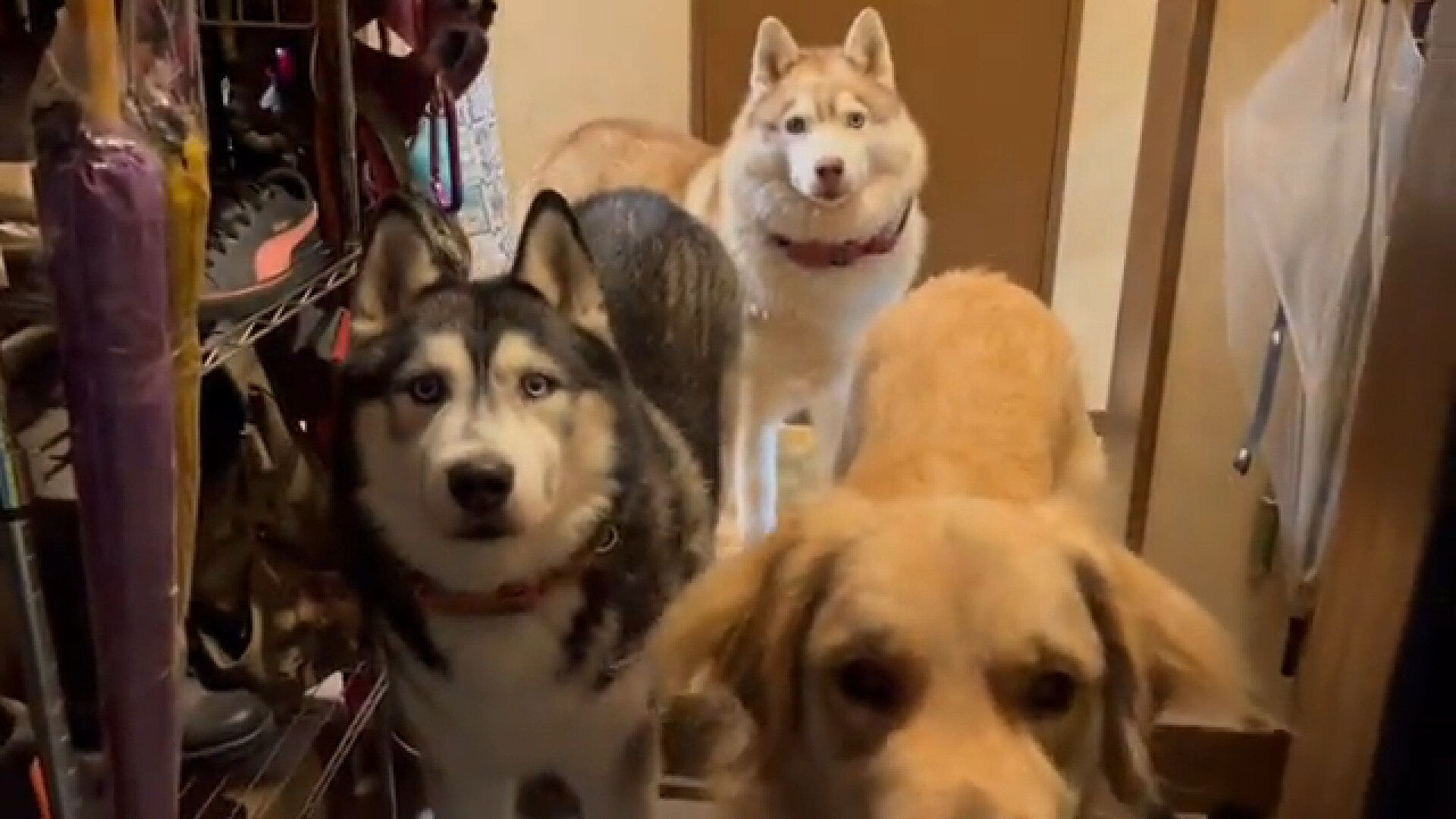 いざやさん(@nuetanp)がXに投稿した動画に8万いいねが集まっています。ゴミ捨てからもどり玄関を開けると、そこに待ち構えていたのは3頭のワンちゃんたち。みんなでいざやさんをお出迎えと思いきや、実はこの光景には理由があったようです。
