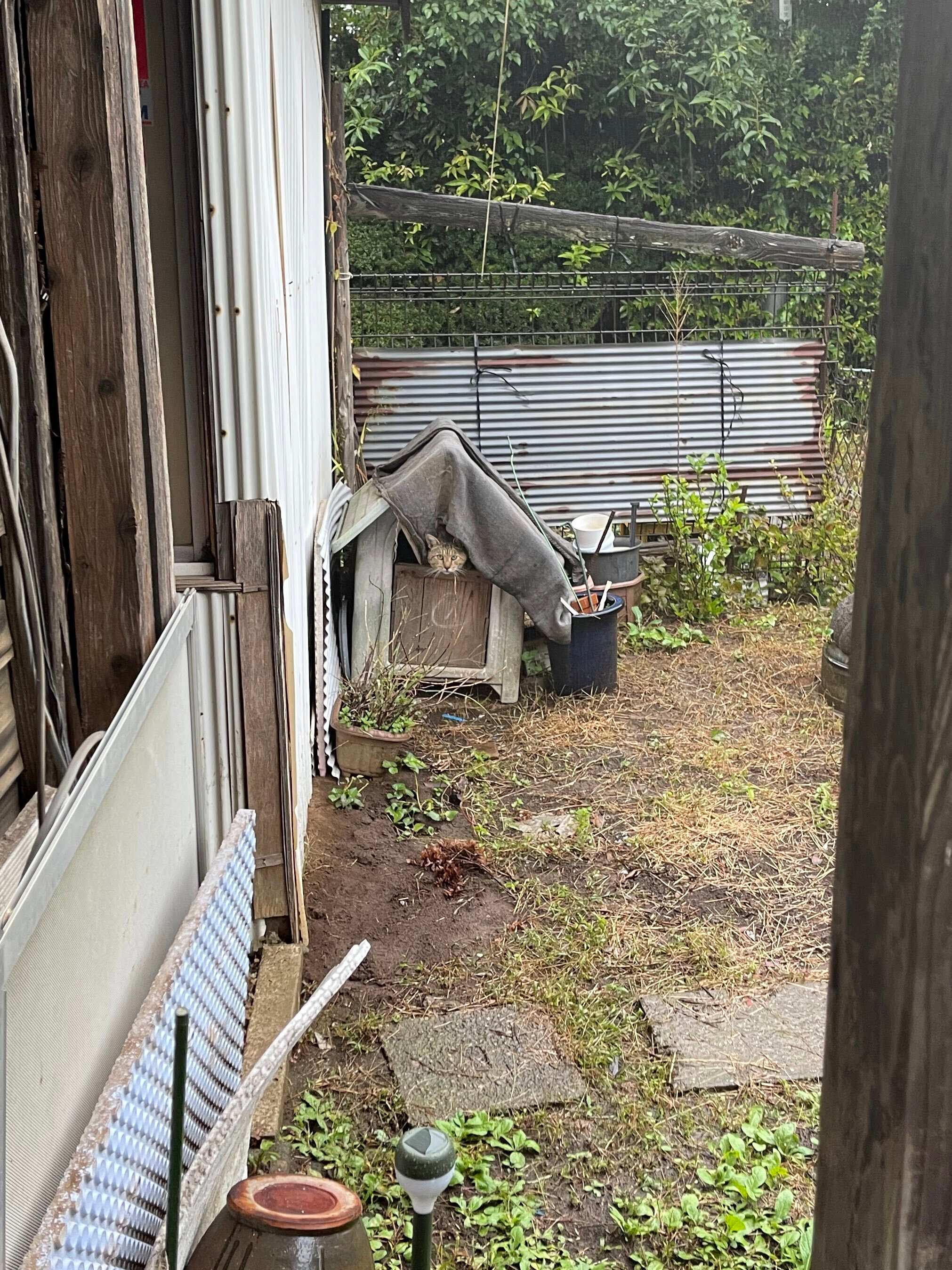 写真に写るのは、野良猫くんがよつばとポン酢さん宅の犬小屋からひょっこり顔を出す姿。