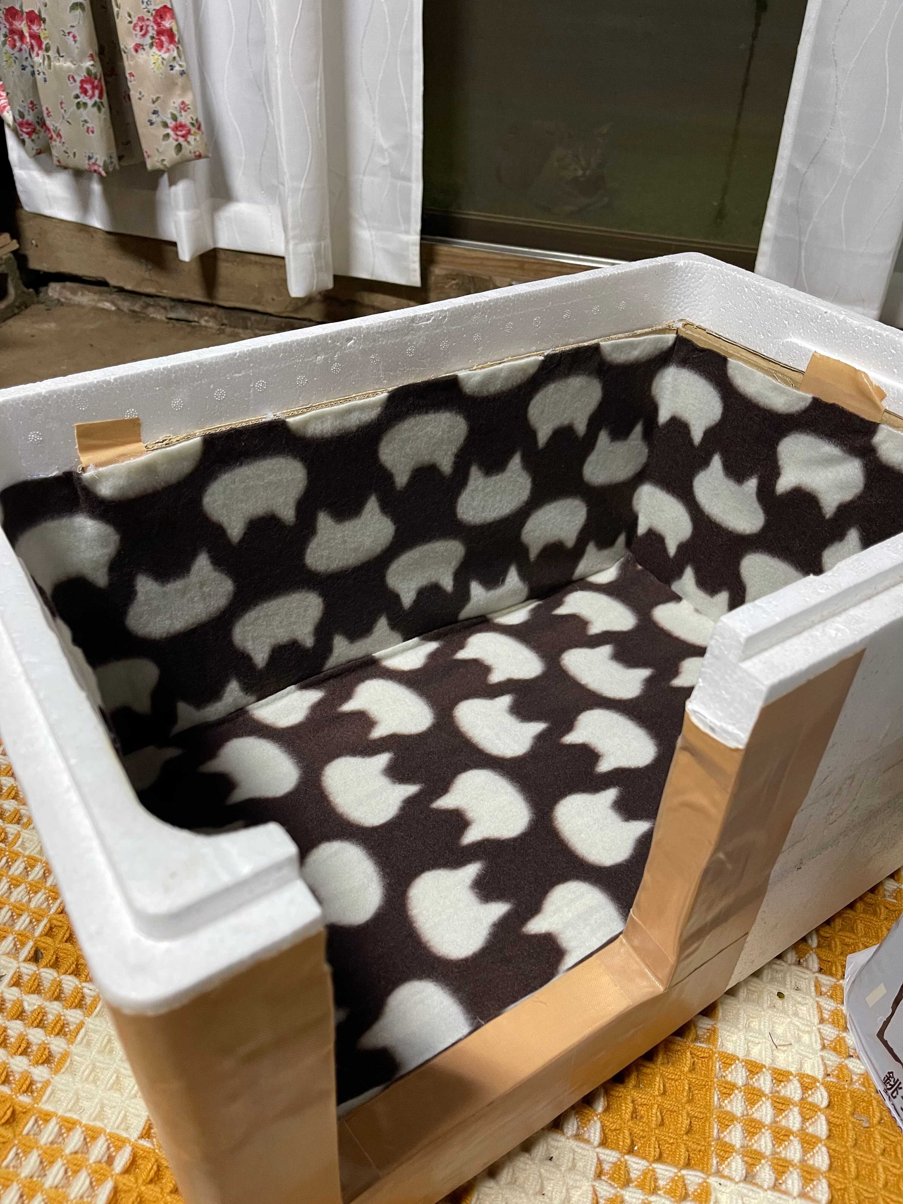 偶然にも、猫ちゃん用に用意された場所をみつけたゴン蔵くん。布団と屋根があって、きっと居心地がよかったことでしょう。