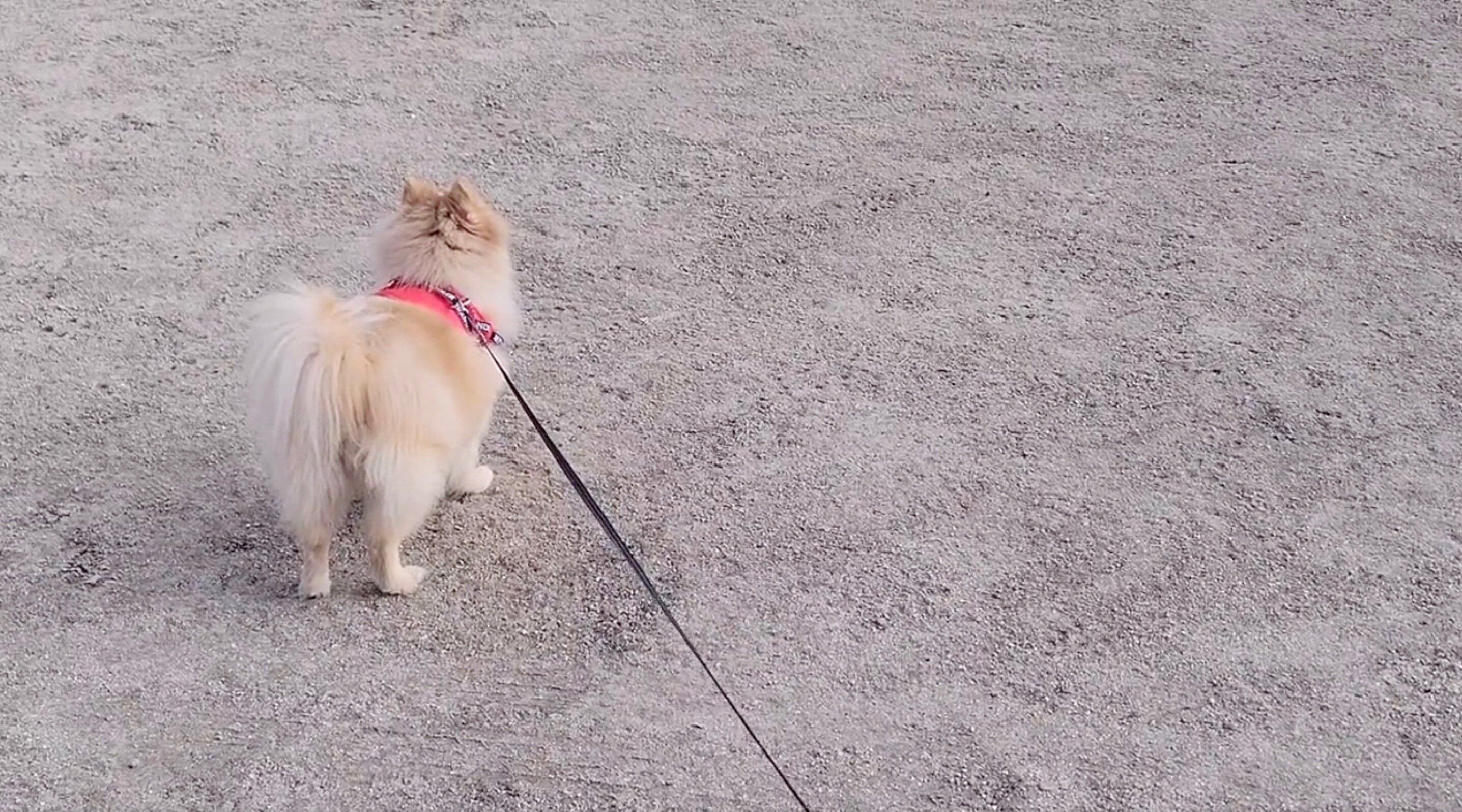 「こむぎ行くよ」と呼ぶ飼い主さんの声もむなしく一向に動こうとせず、飼い主さんは困惑している様子。