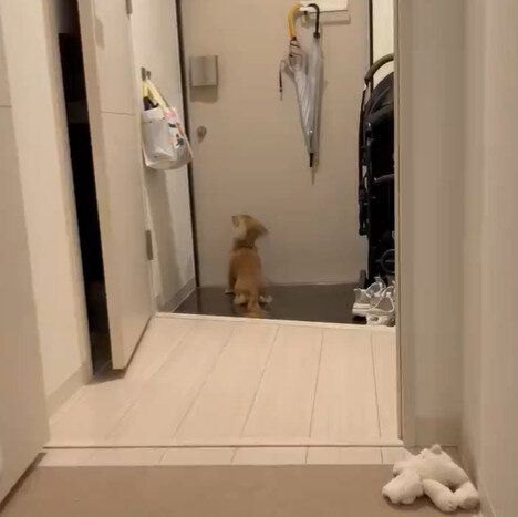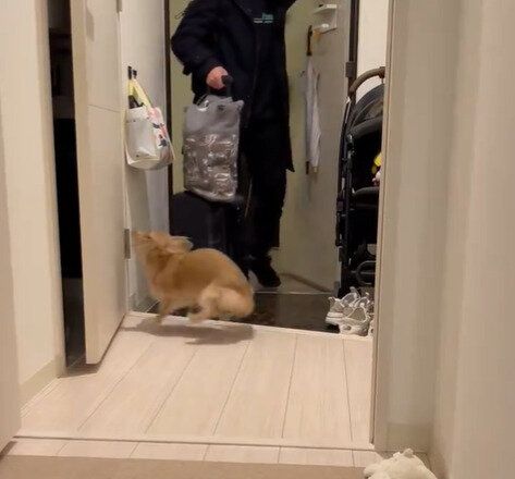 「出張帰りのパパを全力でお出迎え」というコメントが添えられた今回の投稿。そこには、まだ開いていないドアの前で待ち構えるちゃちゃちゃんの姿が映っていました。