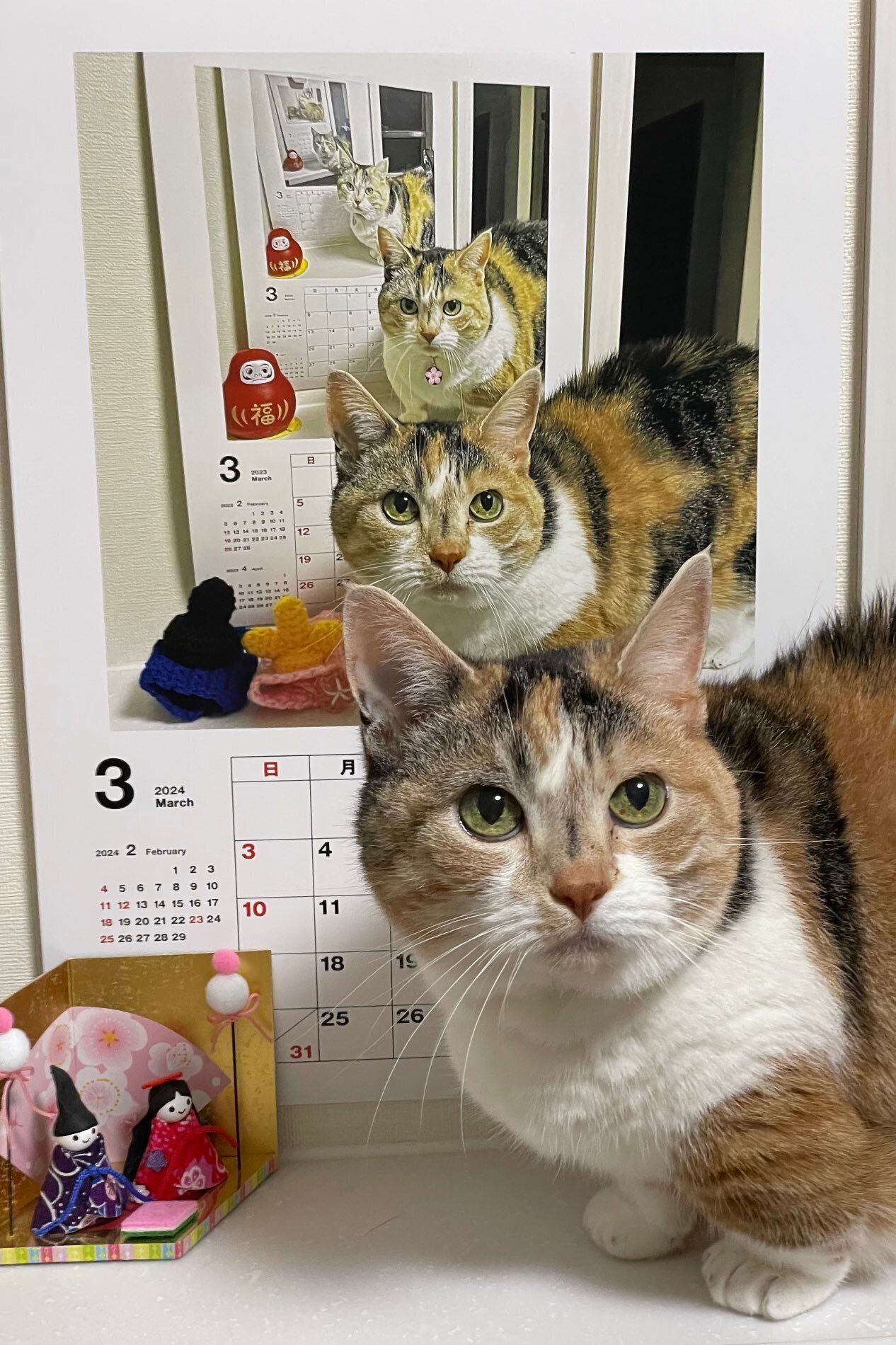 しかし驚くのはその背景。はなちゃんがバックにしているカレンダーには、同じく前年のカレンダーを前にしてポーズを決める花ちゃんの姿が!