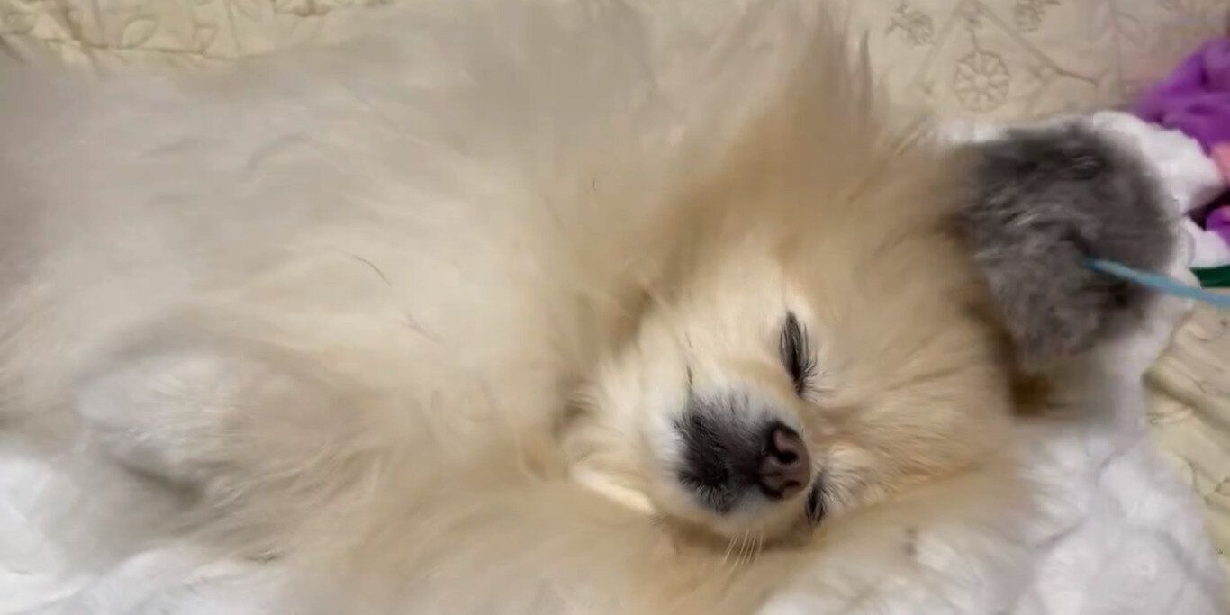 ポメラニアンの大福ちゃんのかわいい動画を投稿した飼い主さん。横になっている大福ちゃんのまぶたはトロトロで、今にも眠ってしまいそうです。