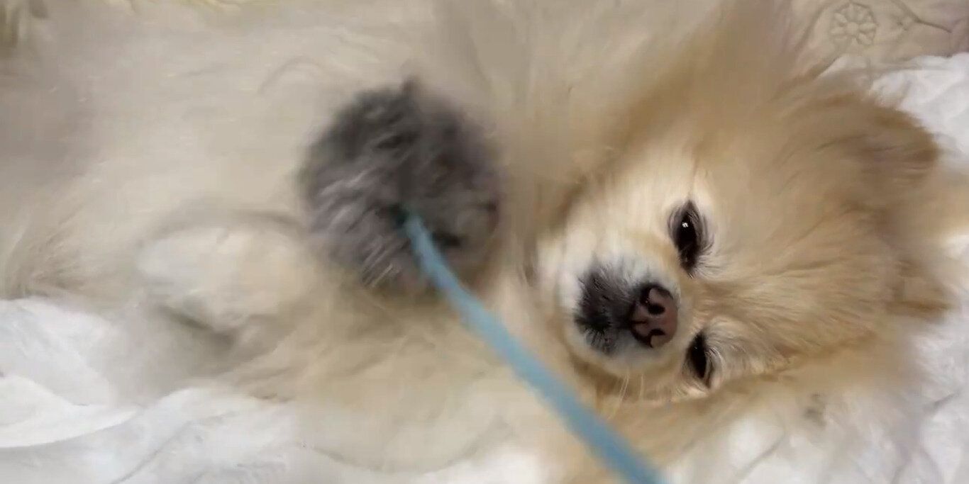飼い主さんが先端にモフモフした毛玉の付いたおもちゃで遊びに誘いますが、相変わらずぼんやり。