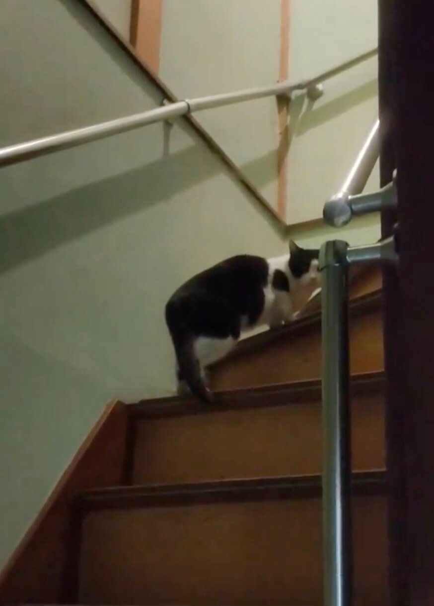 階段が映し出されると、そこにいたのは、なんと見知らぬにゃんこ!