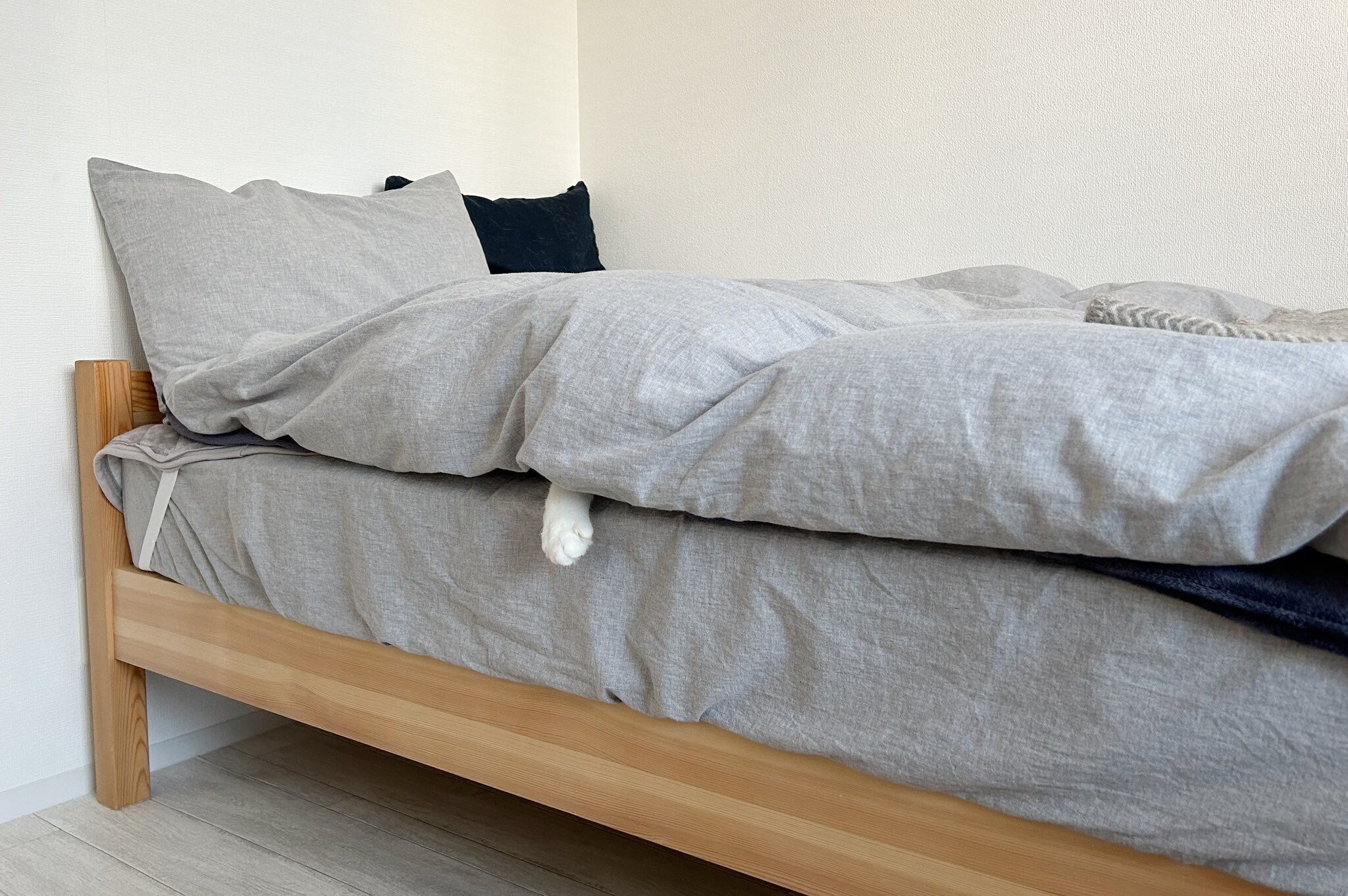 一方、猫の手が写る写真では、人間用の布団の間から小さく白い手がのぞいていました。