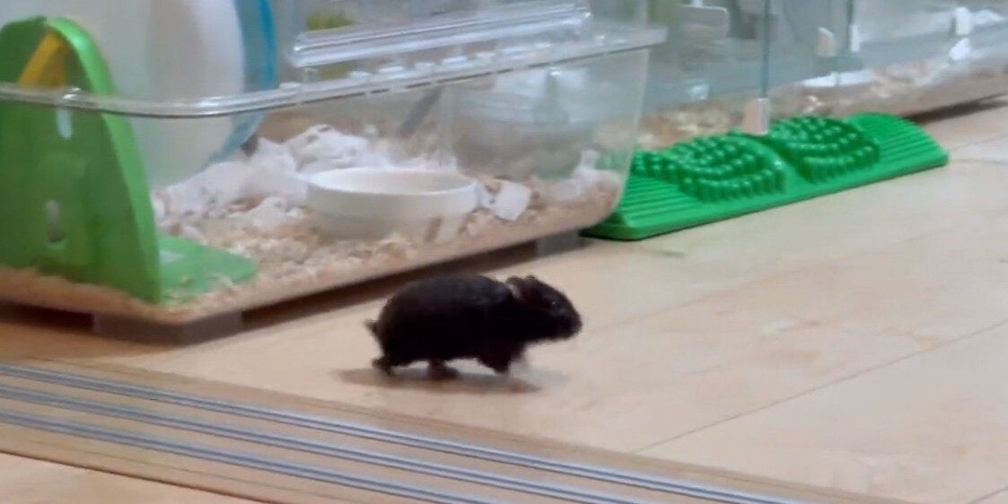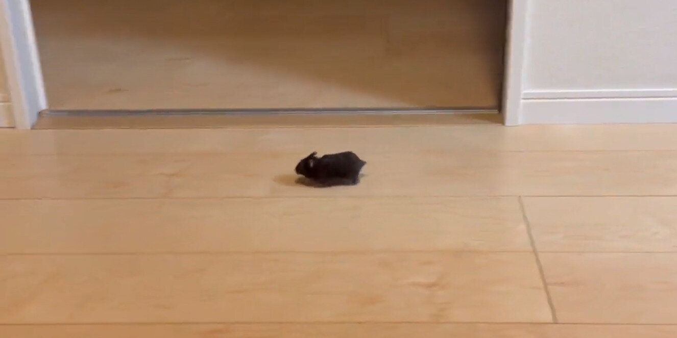 げっしのおうちさん(@roborogoro)がXに投稿したのは、いっしょに暮らすハムスター・めかぶちゃんのお散歩中に起きたハプニングの映像。かわいく部屋を走り回っていためかぶちゃんが突如身を翻し、華麗に回避する姿に注目です。