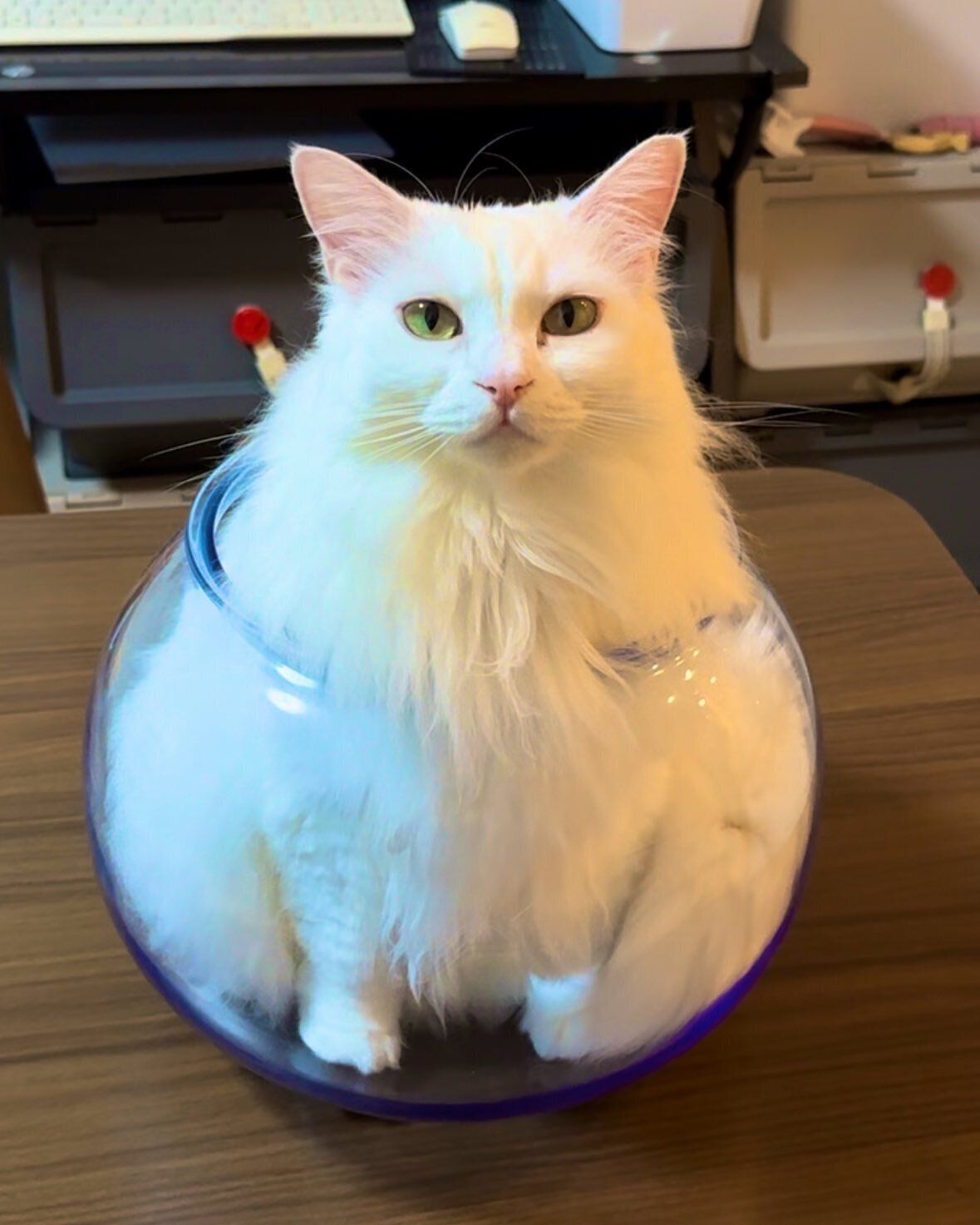 何も起きていないかのように真顔の雪之丞ちゃんですが、首から下を見ると、白いフワフワの毛並みをした体がすっぽりと透明の金魚鉢に収まっています。