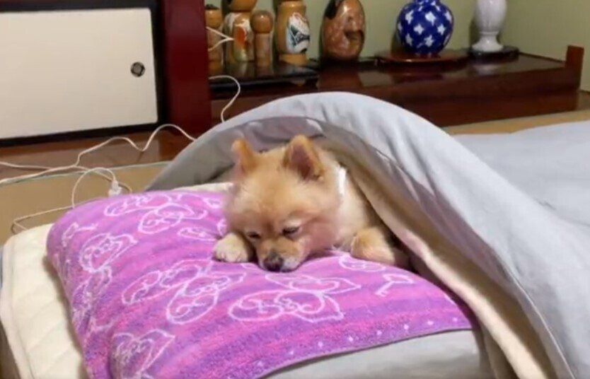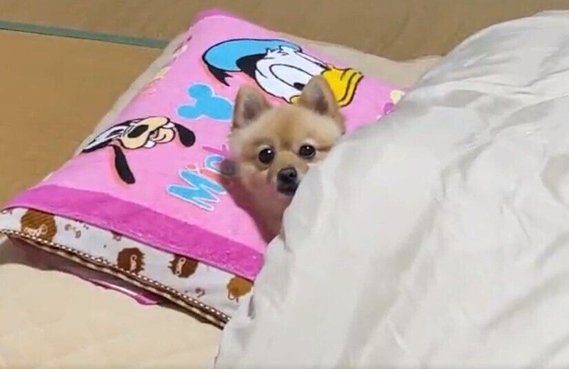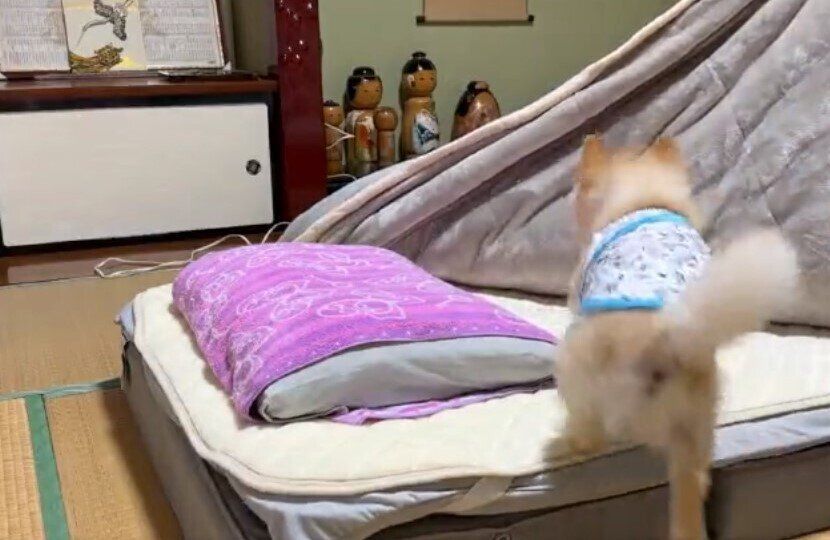 飼い主さんに布団をめくってもらったポメくん。トコトコと布団の中に入っていきます。