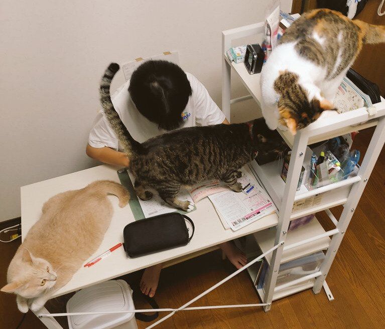 「邪魔してないよ! 応援してるだけ」3匹の愛猫サポーターに見守られて勉強する娘さんの集中力が凄い