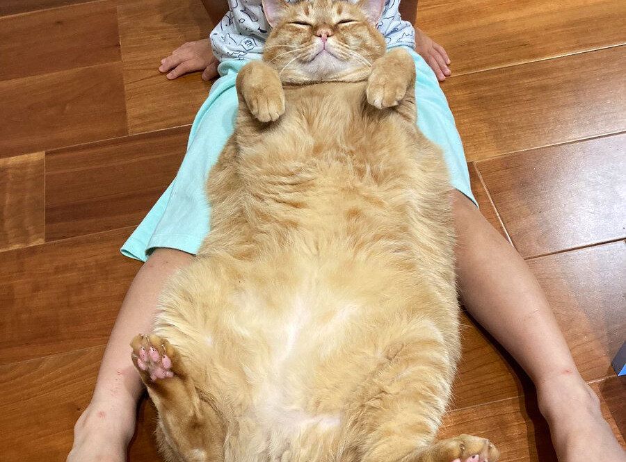 「旅行から帰ってきた長男に安心した猫」というコメントが添えられた今回の投稿。そこには、息子さんの足の間でおへそを上にして寝転がるすずくんの姿がありました。