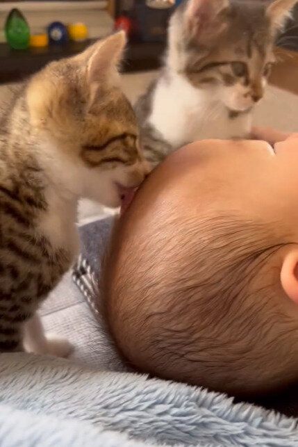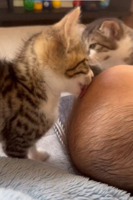 ぽんぽち@5y11mさんが「昼寝中の息子が毛づくろいされてるのワロタ……頭洗ってこよ……」と言って投稿したのは、ぽんぽちさんの息子さんである赤ちゃんの頭を、子猫が丁寧に舐めている動画です。