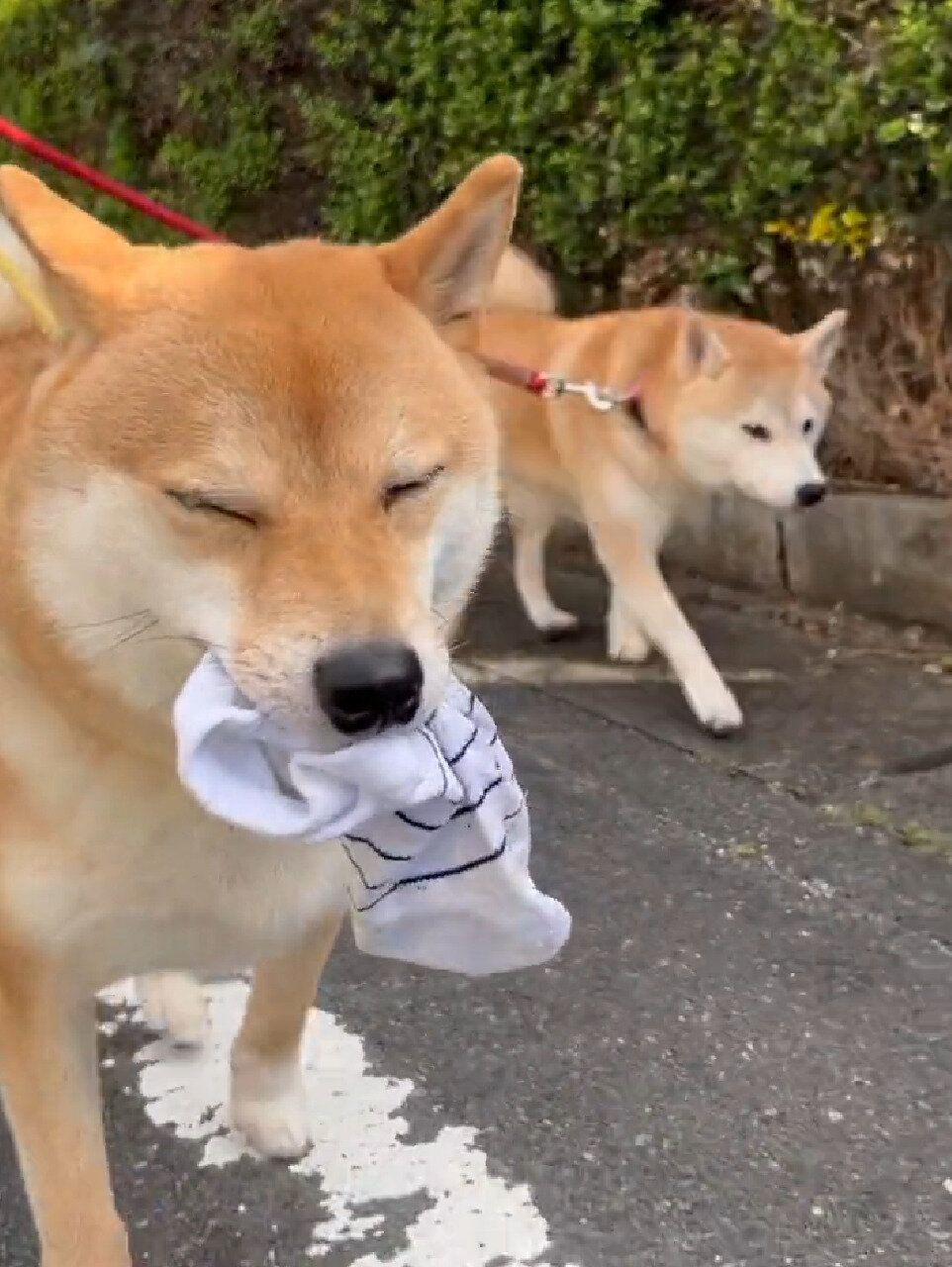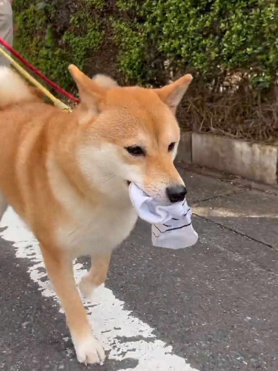 きなここむぎさん(@shiba_kinako_o)が、X(Twitter)に愛犬・こむぎちゃんのお散歩風景を投稿。「どうしても連れていくと聞かないので」と添えられたコメントの通り、こむぎちゃんはあるものをくわえて、ご機嫌そうにしていました。