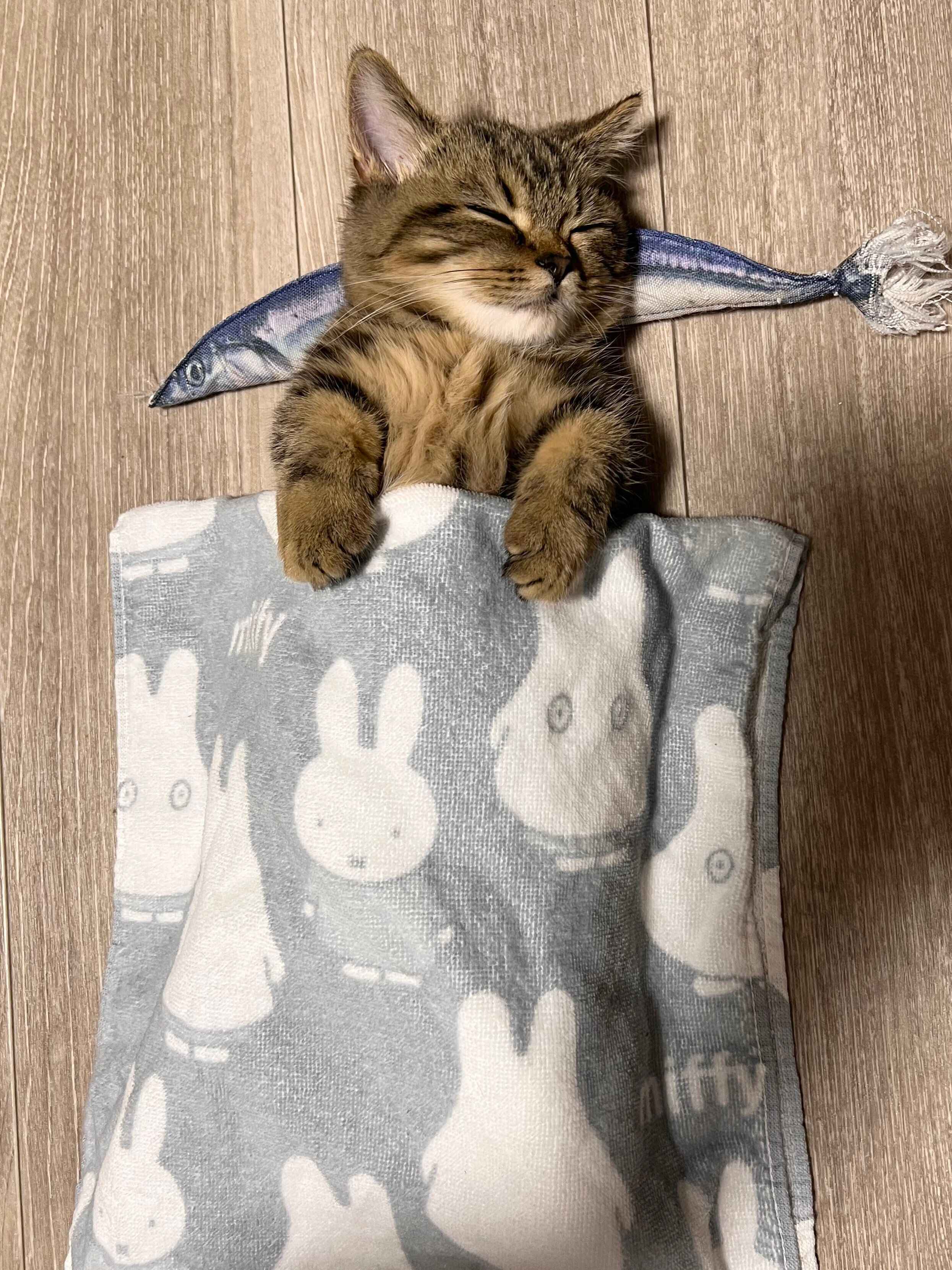 それだけでもじゅうぶんかわいらしいのに、なんと枕はサンマ型。布団にはウサギの有名キャラクターが描かれています。チョパえもんくんのかわいさを、さらに揺るぎないものにしていますね。