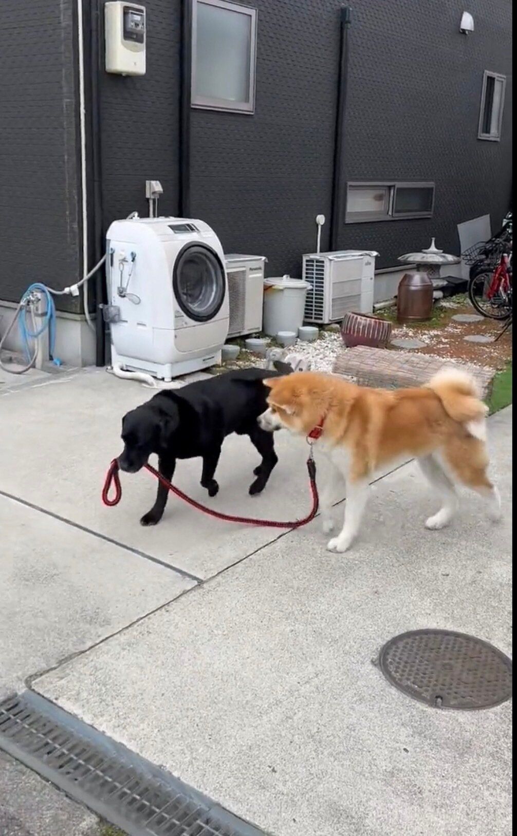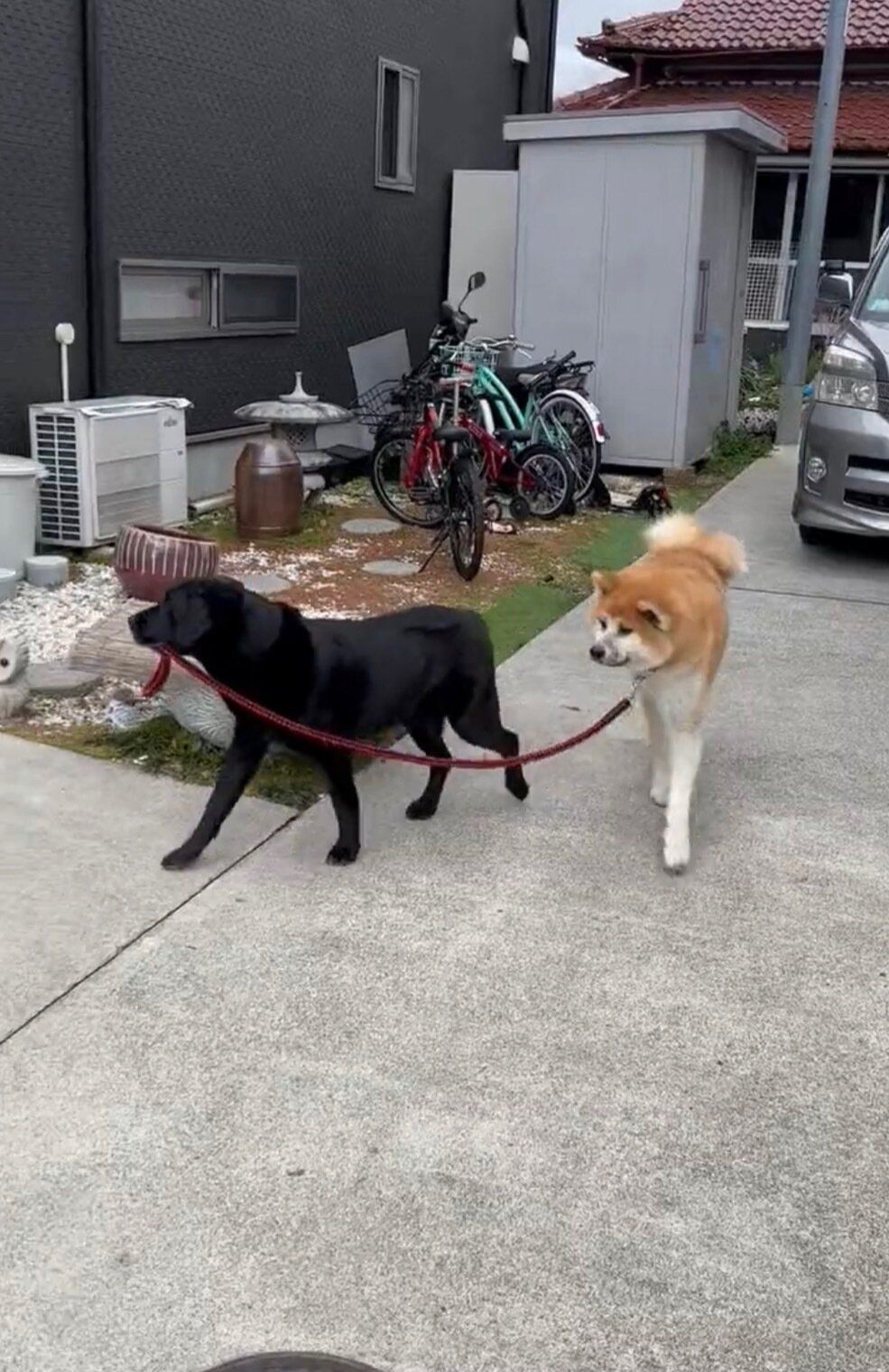 なんと、秋田犬のリードをラブラドールが引っ張り、ご自宅の敷地内を散歩させています!