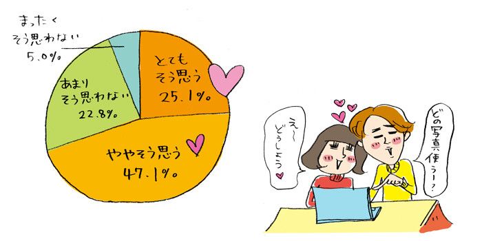 当然、「夫婦で年賀状を作ることがいいコミュニケーションになる」と答えている人が7割超。「どのデザインにする?」「写真はこれにする?」など夫婦間でやりとりをしながら、自然と思い出話に花が咲いて♪なんてこともありそう。年賀状は、1年のごあいさつでもありますが、家族の大切なコミュニケーションツールとしても、今年は作ってみたくなりますね。