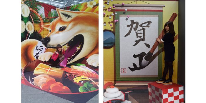 そんな注目の年賀状に関してホットなイベントが開催されました。ブース内には大きなトリックアートが出現! 夫婦や友人など二人参加で完成する「二人でHAPPY年賀状」パネルや、お一人様でも体験できる「書き初めしている風年賀状」トリックアート、 来年の干支を取り入れた「戌に食べられそうなお雑煮年賀状」トリックアートフォトパネルが設置され、当日は、カップルや家族連れなどが撮影に参加しながらひと足早いお正月気分を満喫していました。