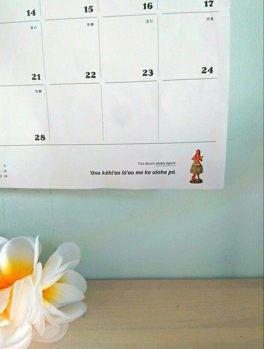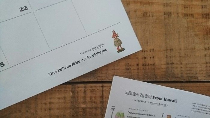 各月のカレンダーの下の方に書いてあるハワイ語が、ハワイアンたちが代々受け継いできた“アロハ・スピリット”と呼ばれる教え。見るだけで、ふっと心が軽くなる、家族にやさしくなれる、そんな格言です。各月のページはハワイ語のみだけど、最後に解説もちゃんとあるのでご安心を!
