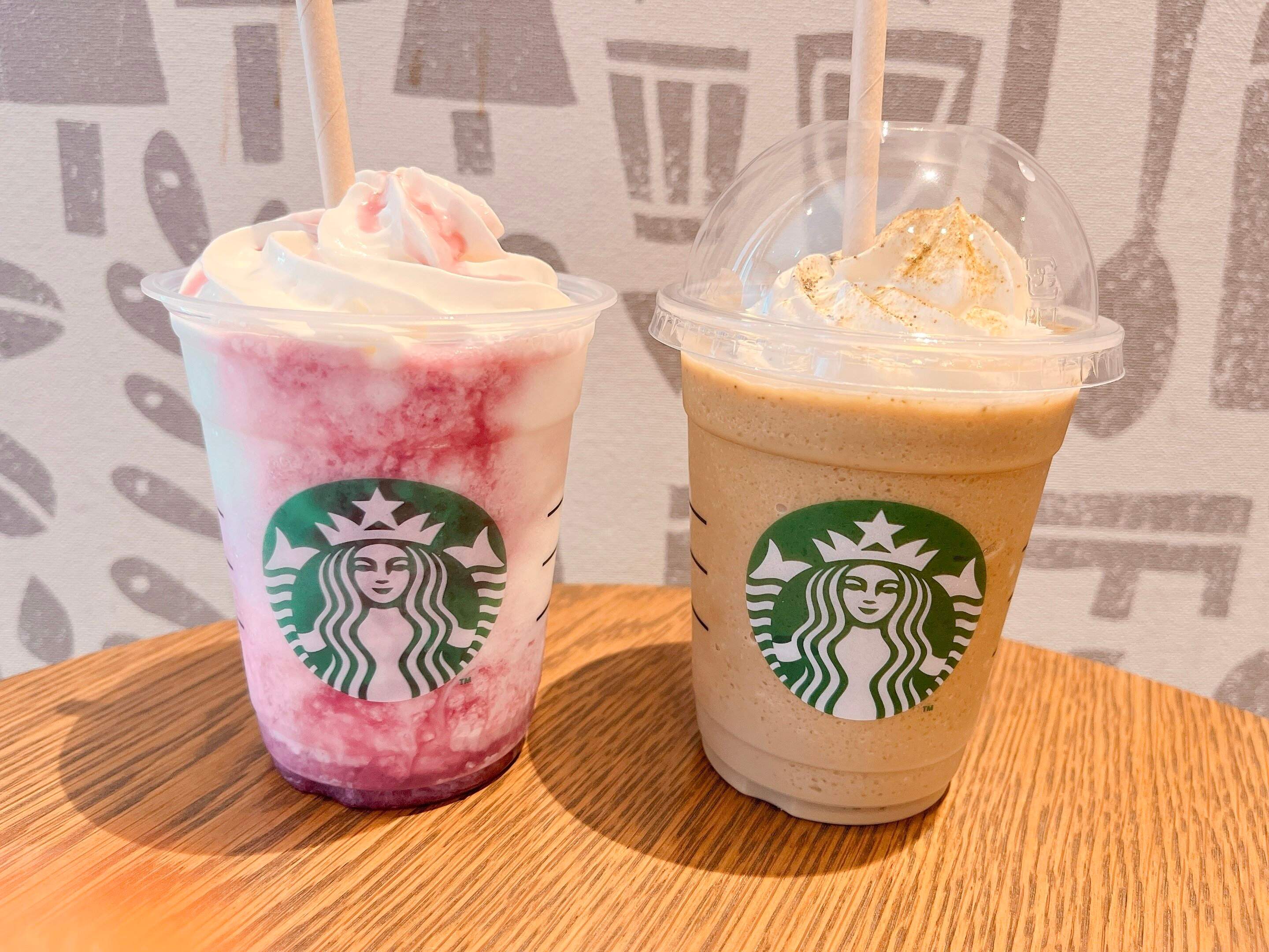 今回はこちらの「石川 いいじ 棒ほうじ茶 フラペチーノ」と「山梨 ててっ!! ぶどう ホワイト チョコレート クリーム フラペチーノ」を飲みました!