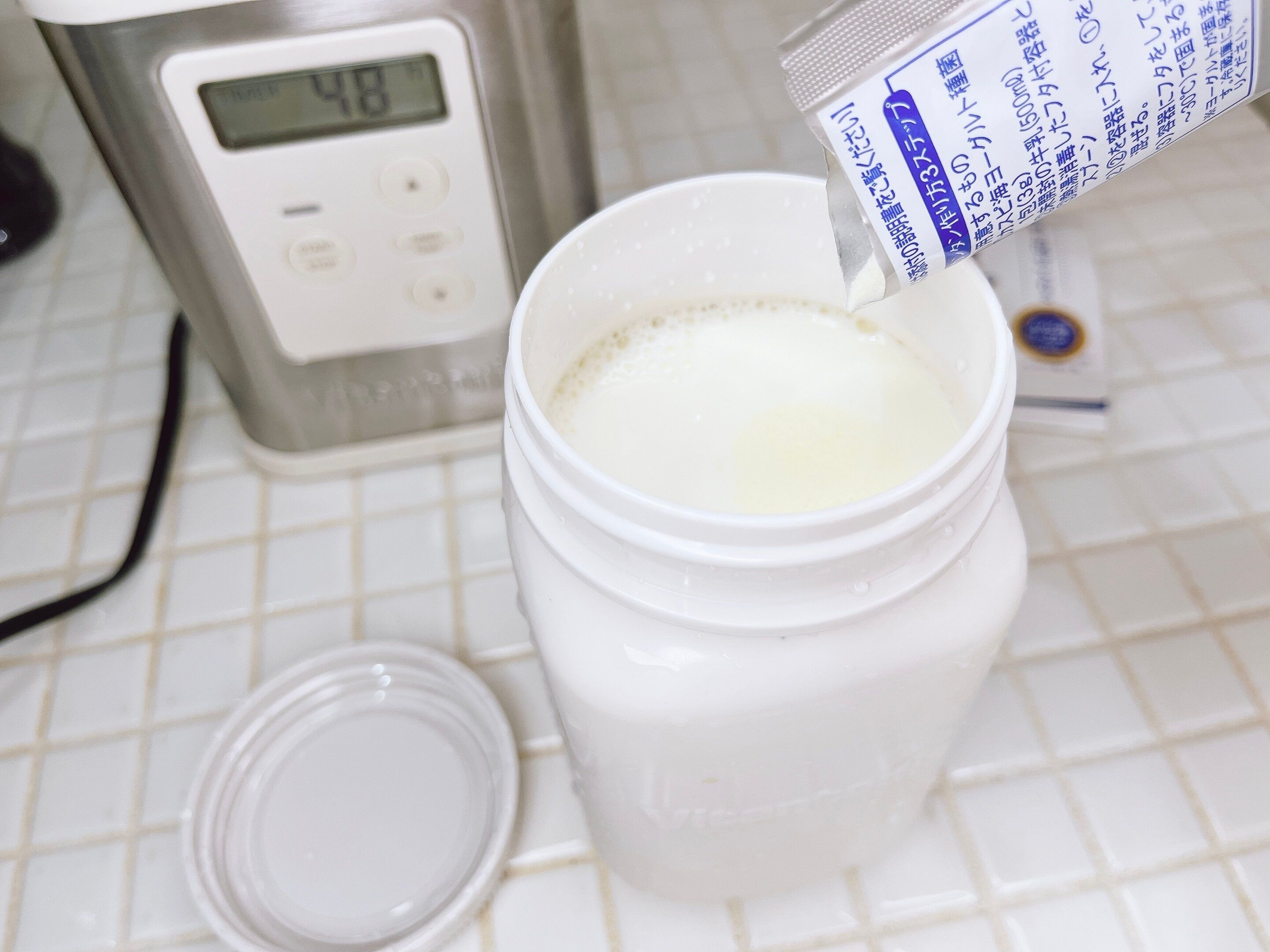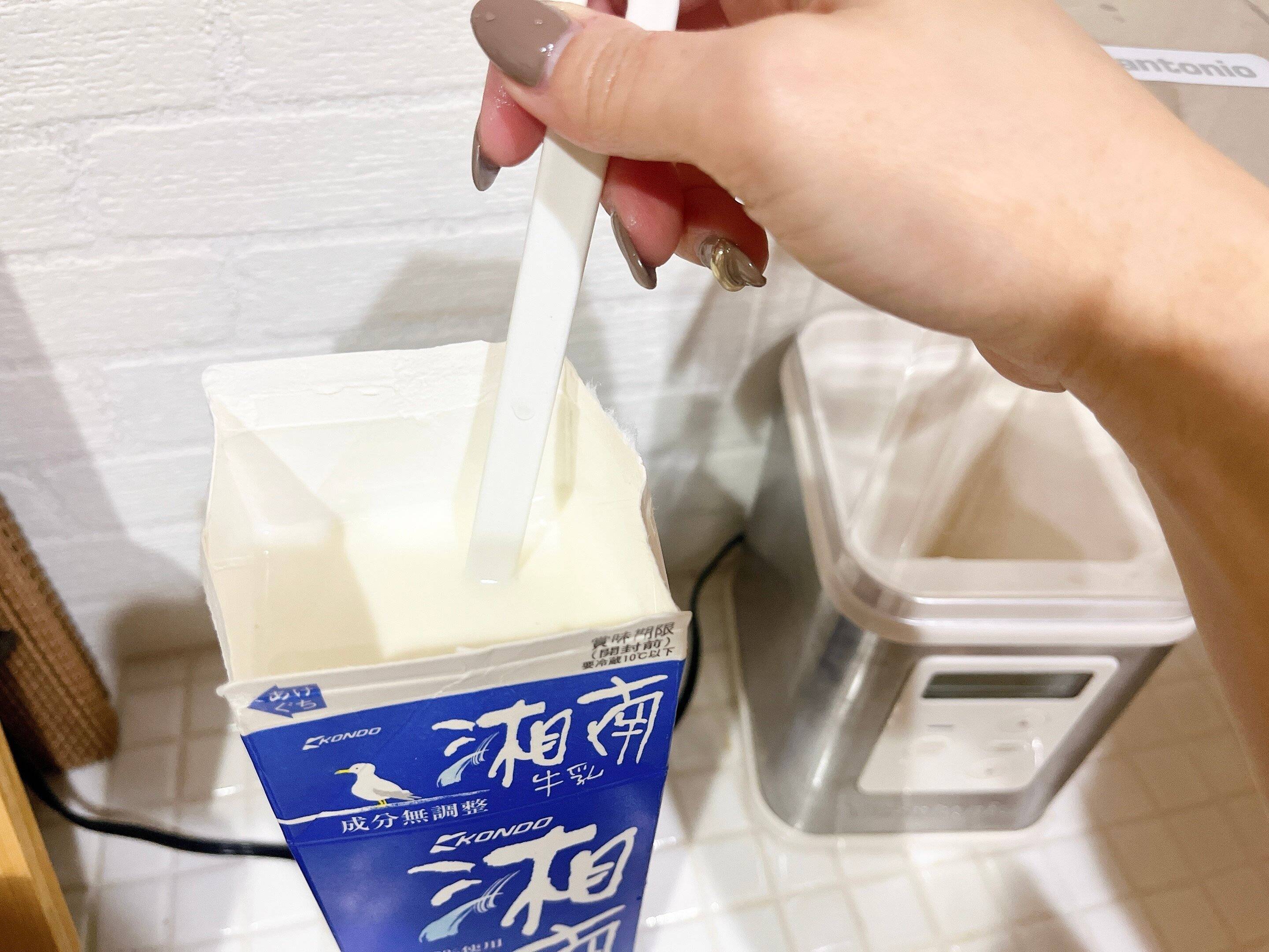 熱湯殺菌した容器に牛乳500ml入れ、粉末種菌(1包)を加えてよく混ぜます。
