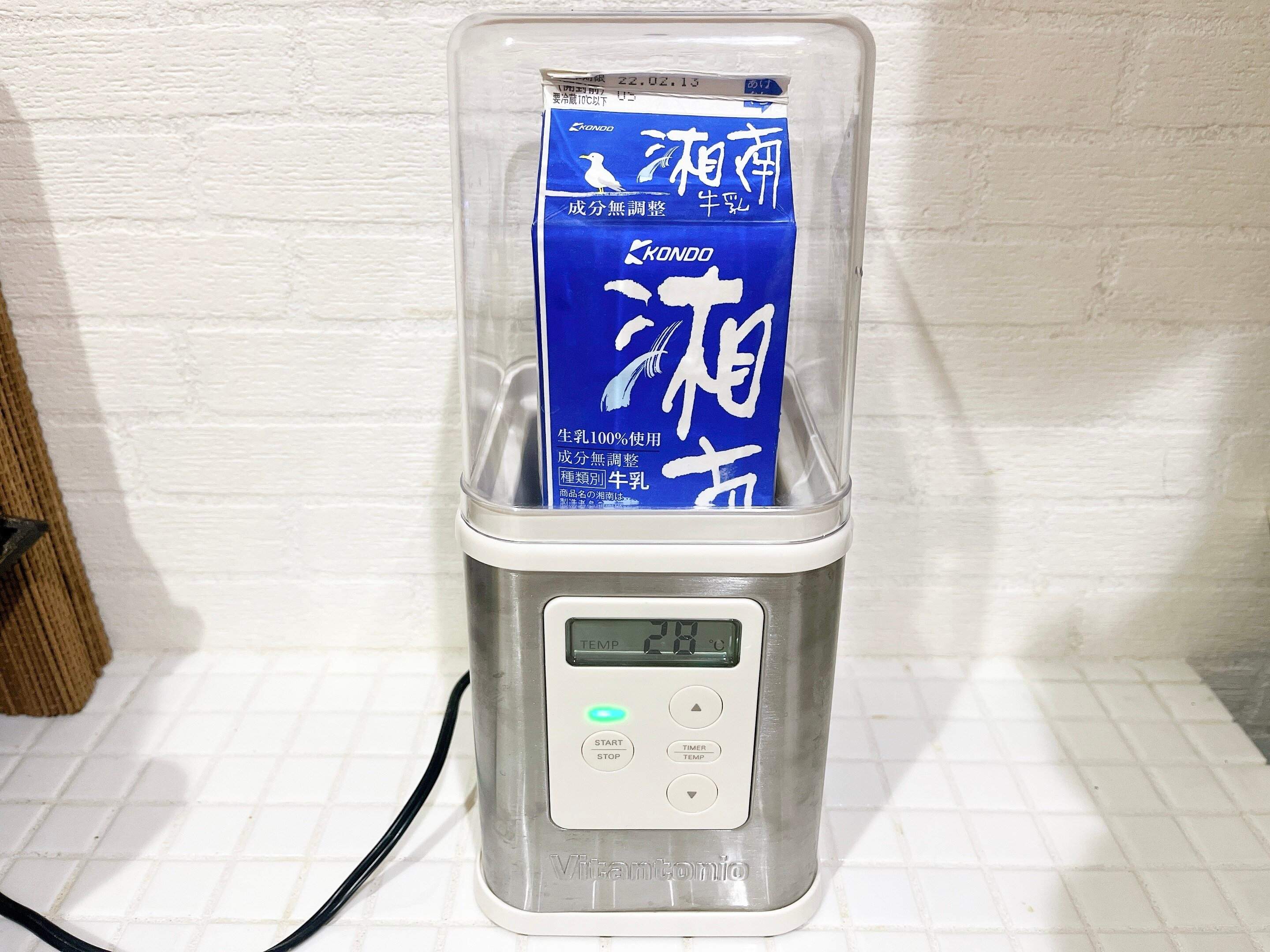 牛乳パックを輪ゴムで蓋をして約28℃12~15時間で設定してスタート。