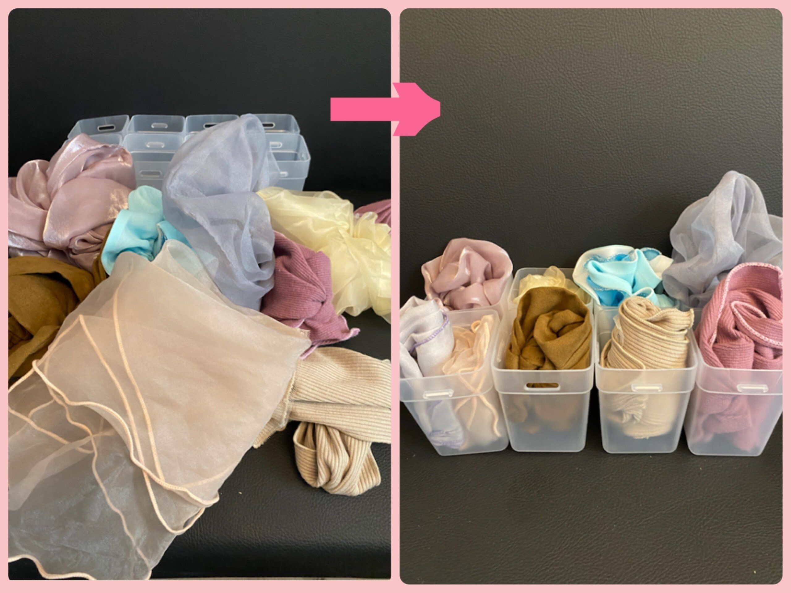 こんなにボリュームがありかさばっていたシュシュとやヘアバンドなどが、見事にすっきり収納出来ました!しかも取り出しやすく、今までごちゃごちゃ探していたのがこれならすぐに必要なアクセサリーが取り出せます♪