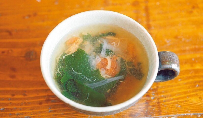 (2)瓶詰のなめたけ、乾燥わかめ、顆粒だし、(あれば)梅干し各適量を加え、お湯を注ぐ。