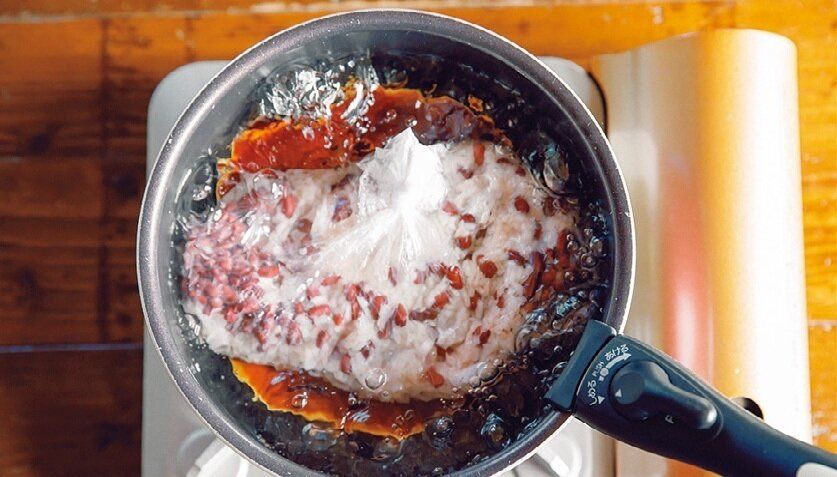 (2)鍋底に皿を置いて、お湯を沸かし、(1)の袋を入れて、中火で約30分湯せんする。