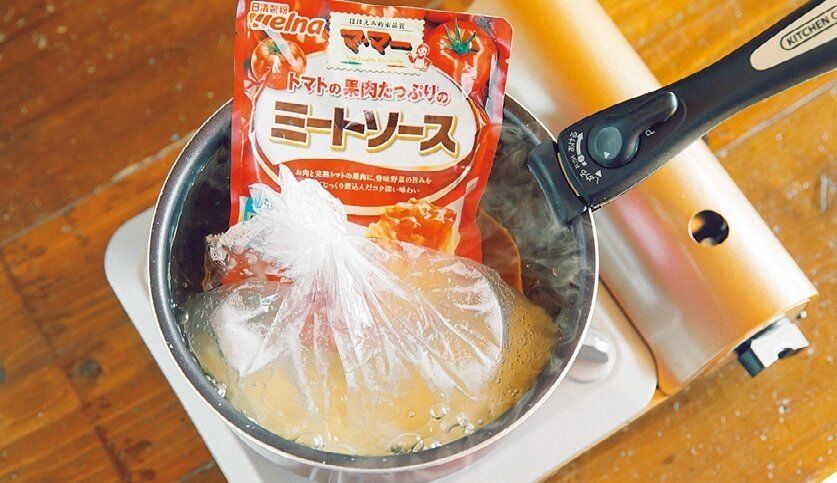 (2)鍋にお湯を沸かし、(1)の袋と、パスタソースの素(パウチ)を入れて、中火で約5分湯せんする。