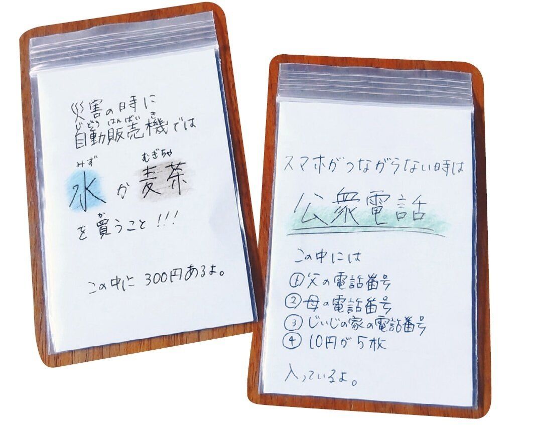 子どもたちには、災害時に必要な情報と小銭を入れた袋を持たせています。