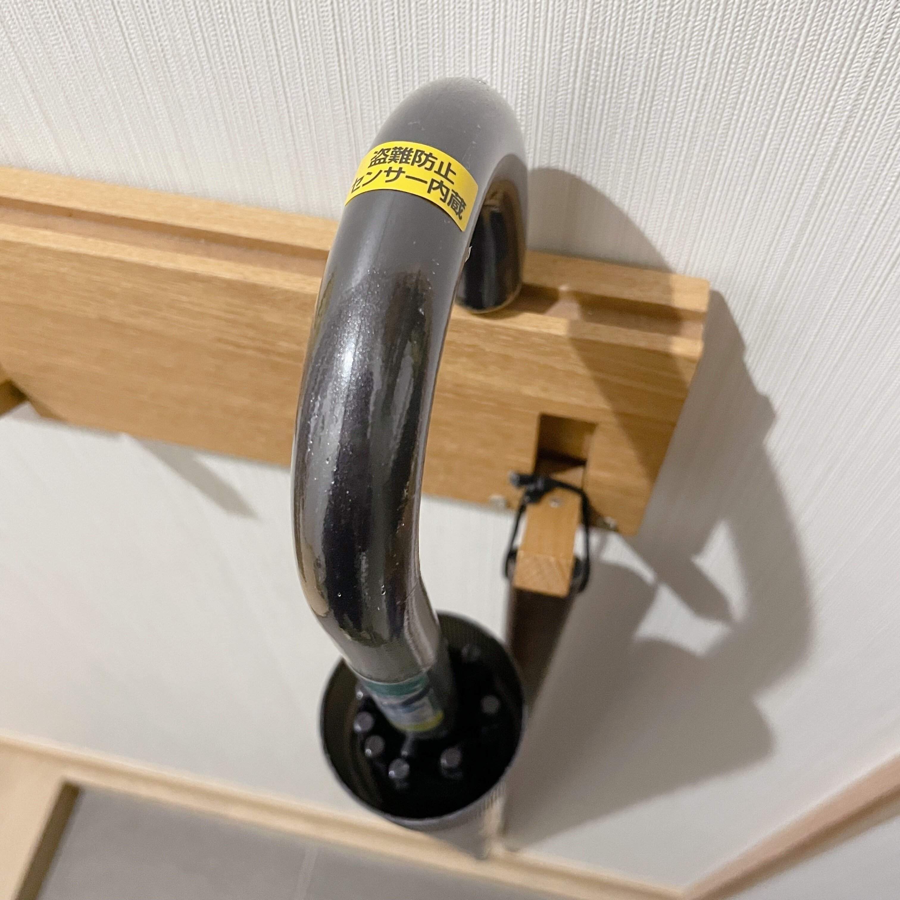 傘の持ち手部分に、「盗難防止センサー内蔵」と記載のステッカーを貼ってみました。