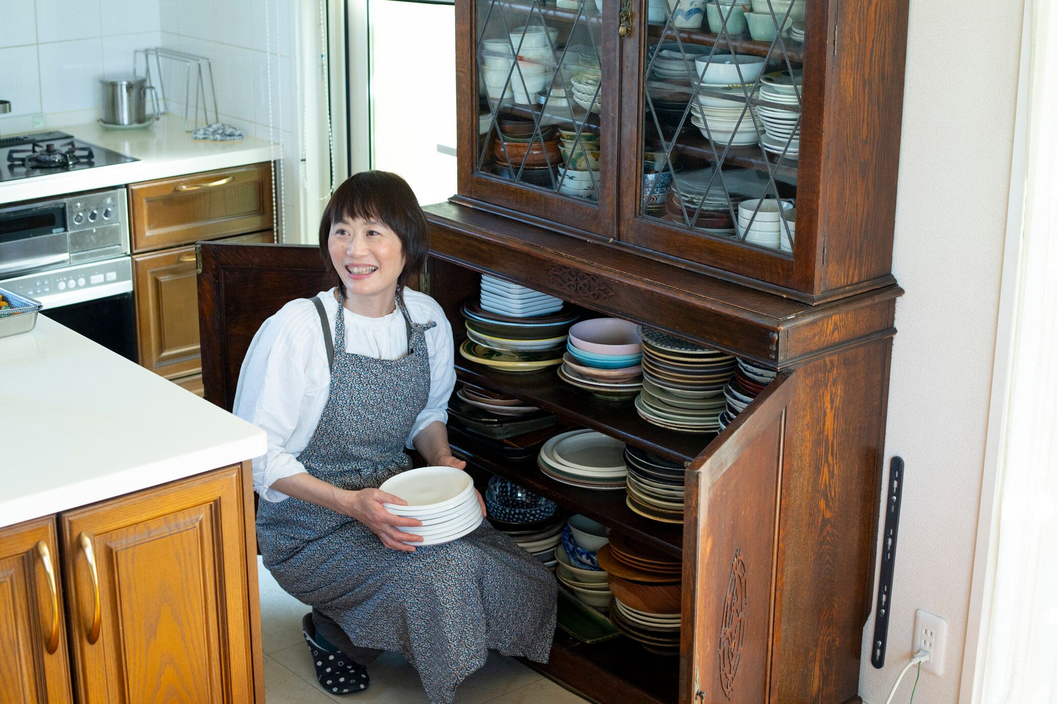 アンティークの食器棚には、結婚当初から集めたお気に入りの食器が。一目ぼれで購入した古伊万里のお皿が、鑑定番組で話題になったことも