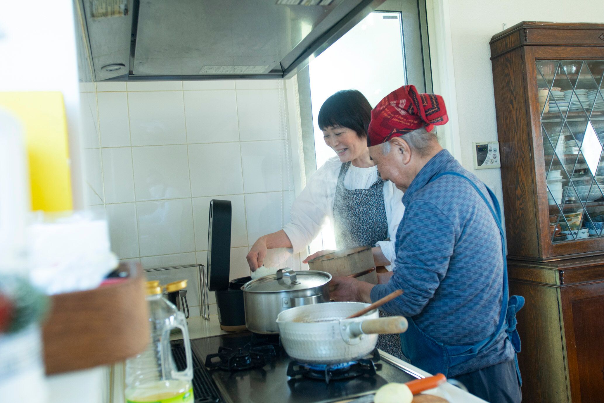 まさみさんが炊飯器を開けると、まさるさんがお櫃をさっと用意。阿吽の呼吸で、料理ができていく。
