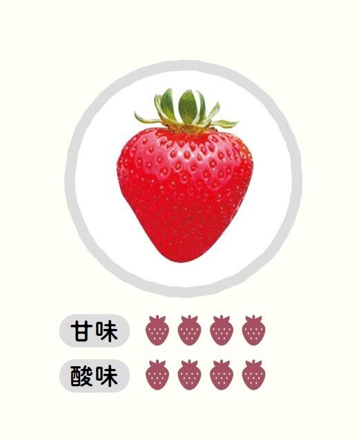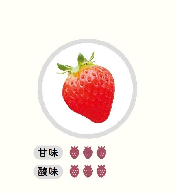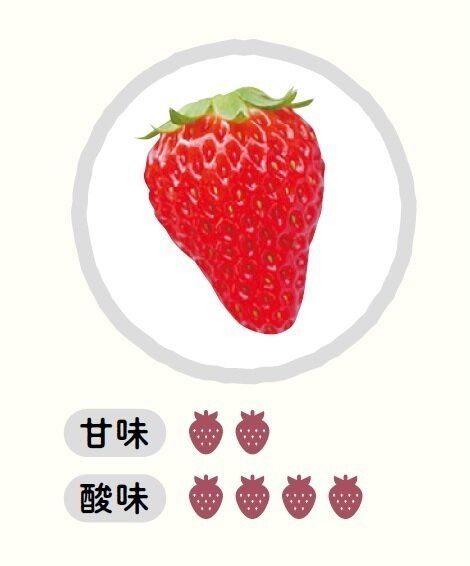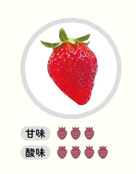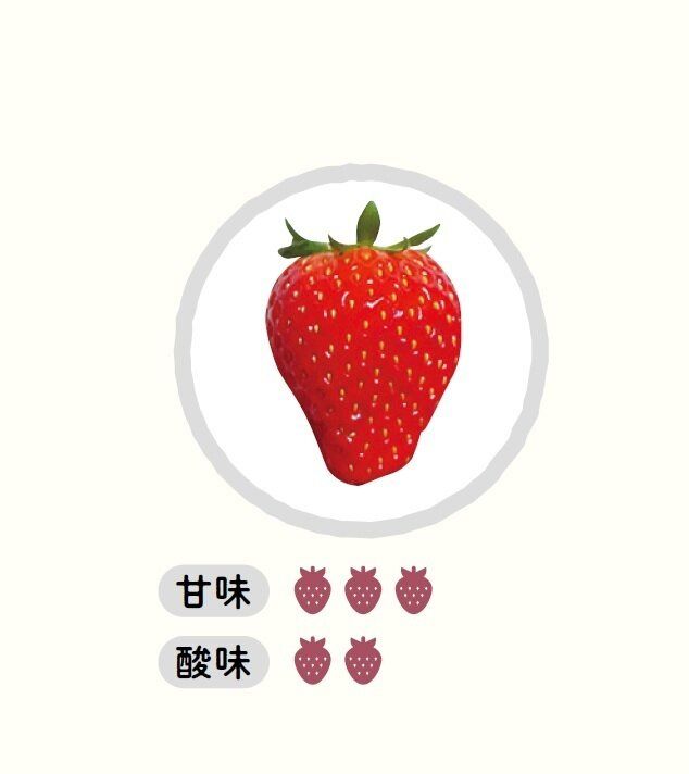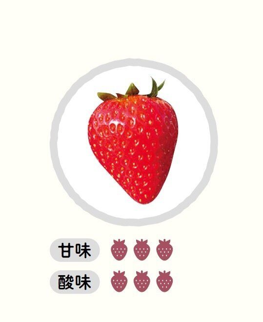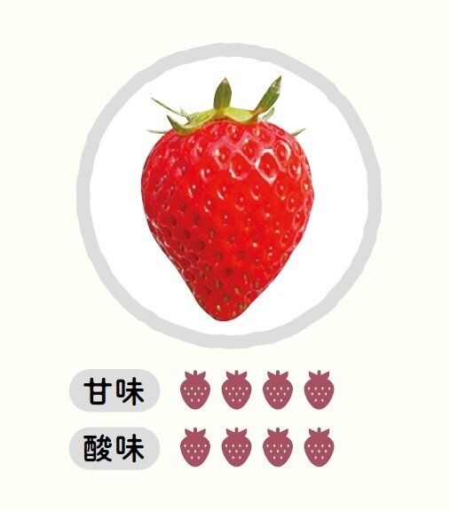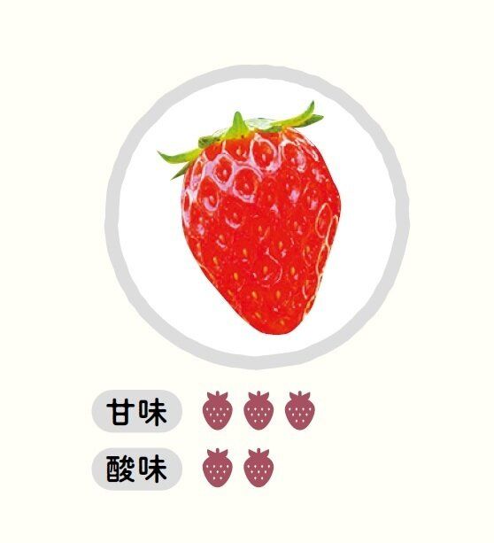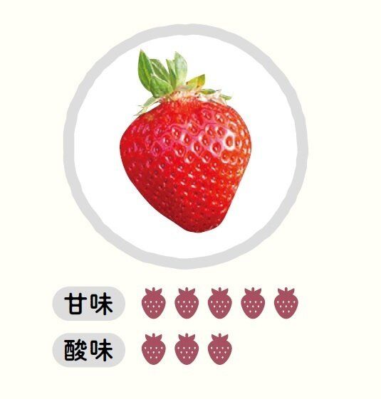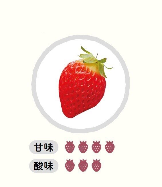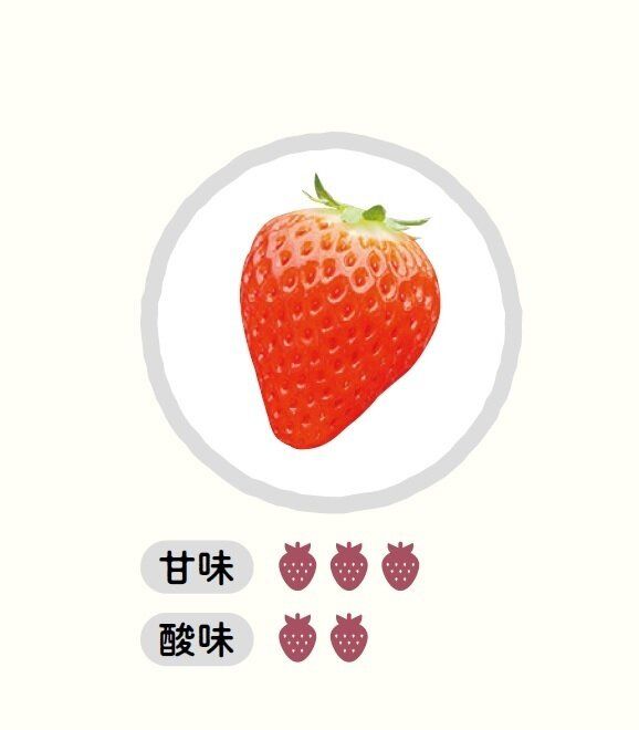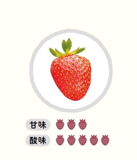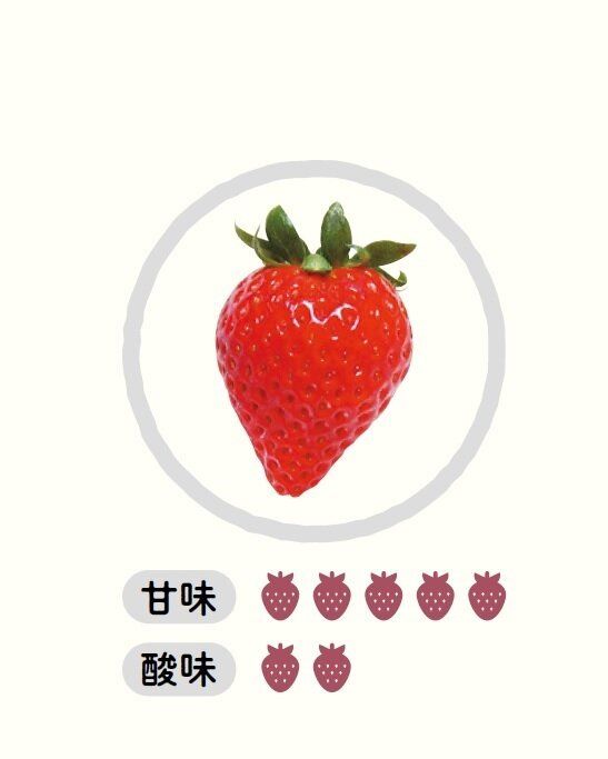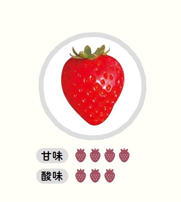 おもな産地は静岡県。大きめサイズで長めの円すい形。酸味と甘さのバランスがよく、甘酸っぱさのなかにコクも感じる。そのまま食べてもおいしいし、練乳とも非常に合う味。