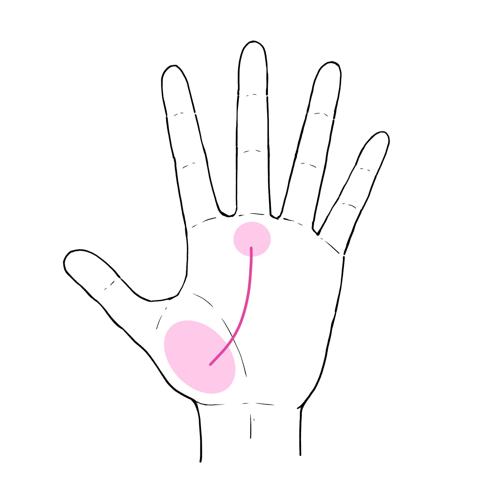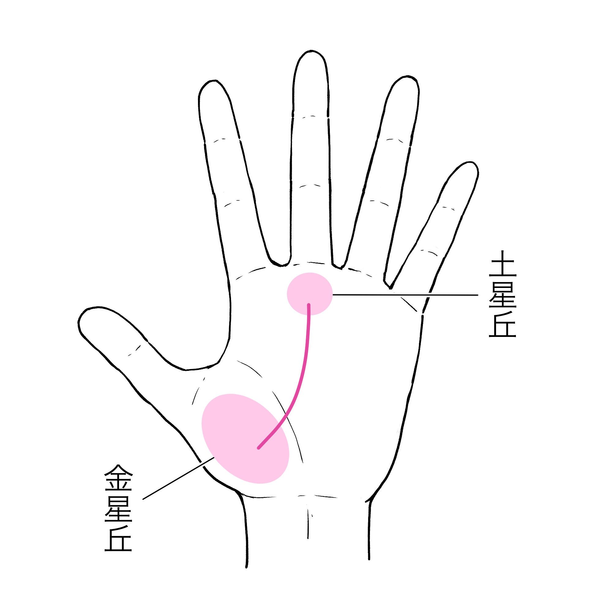 土星丘(中指の下)と金星丘(親指の付け根)をつなぐ線がある人は金銭感覚がしっかりしているタイプ。抑えるべき出費はきちんと抑えることができ、浪費や衝動買いをすることもないので、計画的にお金を貯めるのに向いています。