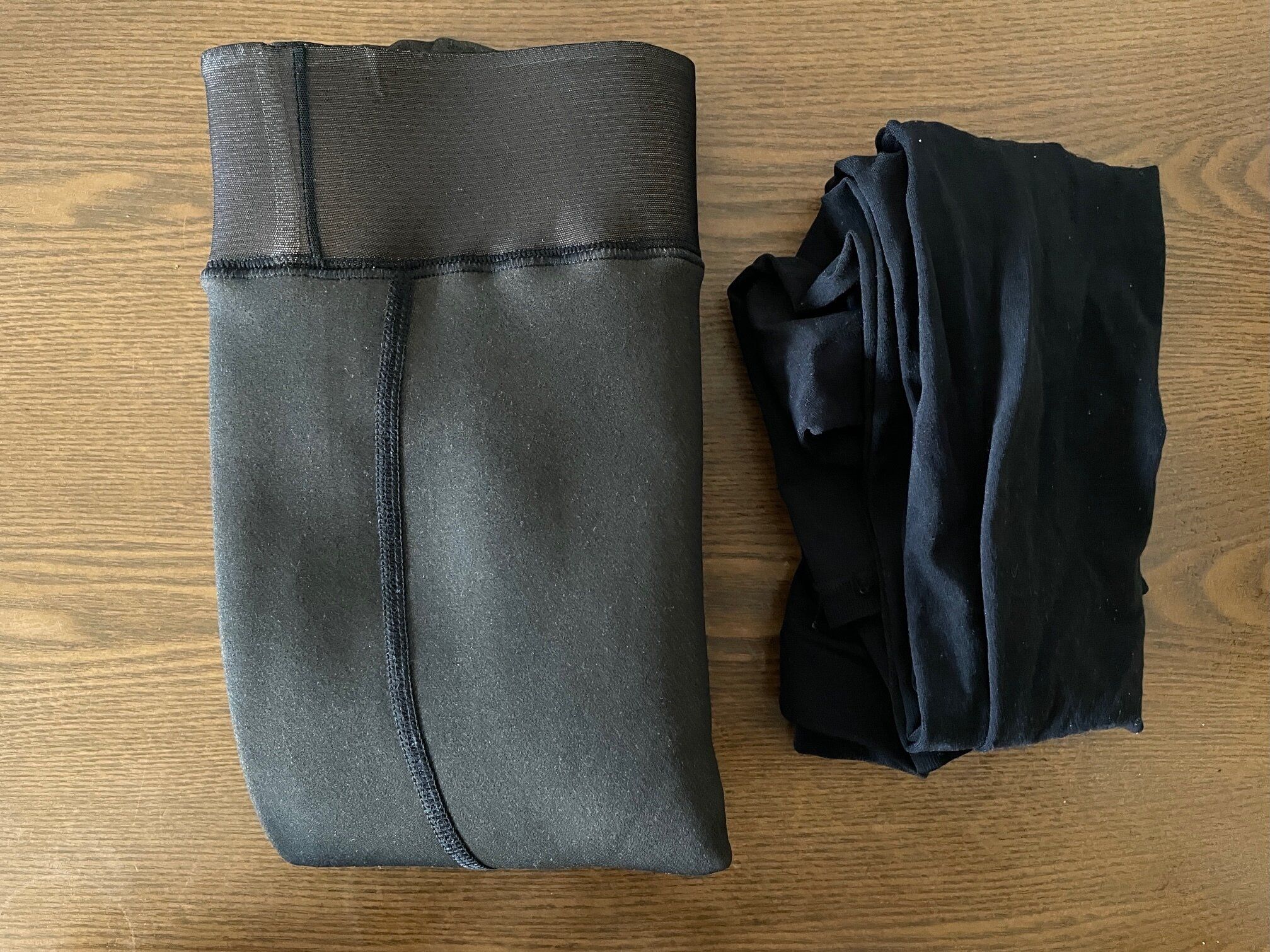 黒タイツとフェイクタイツを履き比べてみます。厚さにあまりの違いがないように、裏起毛の800デニール黒タイツと、1200デニールのフェイクタイツで比べてみました。