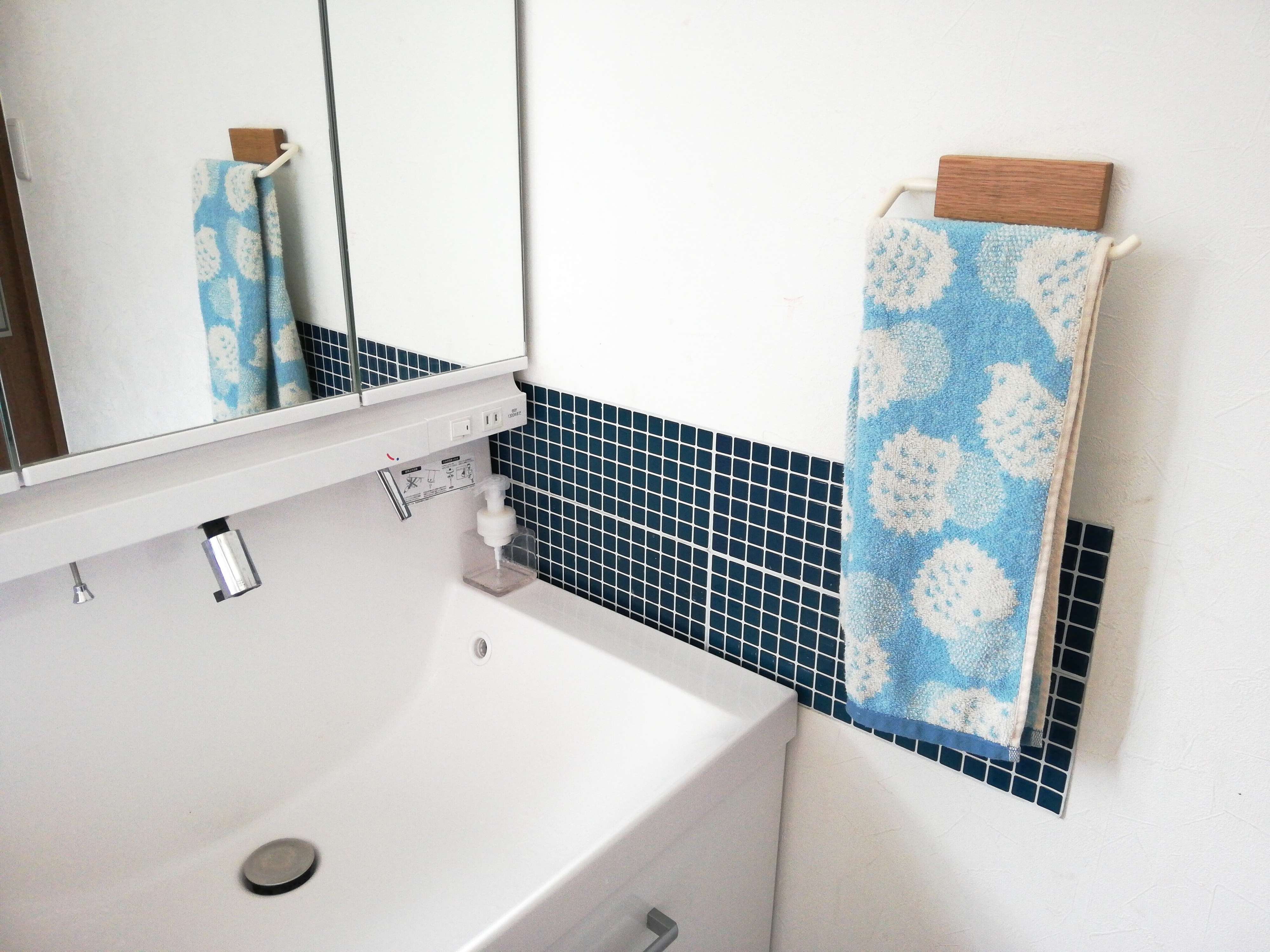 壁紙の上から貼れる「タイルシート」が便利。洗面所の水はねや歯磨き粉の飛び散りで壁紙が汚れるので、これを貼っています。つるんとしているので、拭くだけできれいになるのがらくちん!壁紙が汚れるのを気にすることがなくなりました。