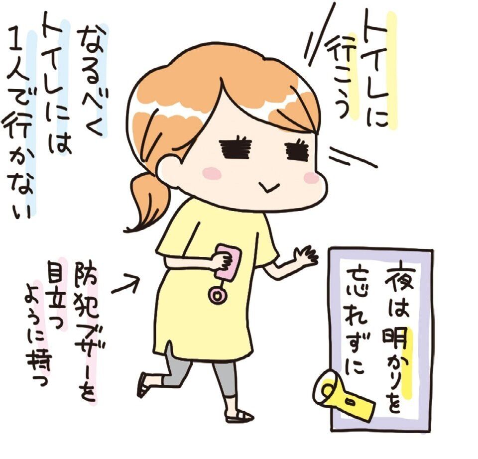 避難所に集まるのは近所の人だけではありません。いろいろな人が集まり、また、人の出入りも多くなります。性的な被害やトラブルを防ぐためにも、なるべく一人行動は避け、離れるときには家族にひと声かけるのを忘れずに。