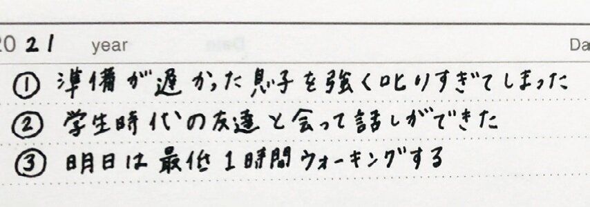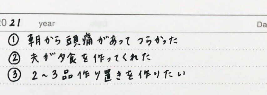 嫌だったこと、体調が悪かったこと、会社や夫への不満や悪口などを記すのもOK。悪い感情を吐き出すことで、リセットするきっかけに。