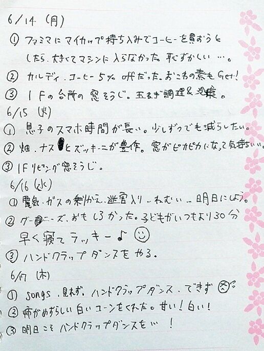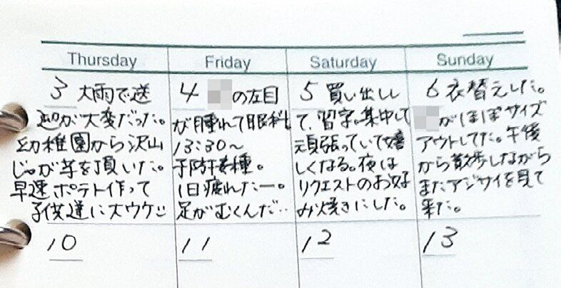 今は子どものことを中心に、数分で書ける簡単な内容に。家族に対してイライラしても、日記に書くことで反省でき、気持ちや頭の中がリセットされます。重たい空気を翌日に持ち越すことがないのも、日記のおかげだと思います。