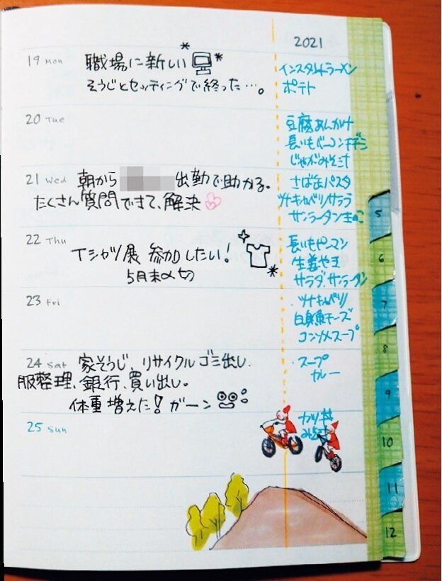 ウイークリーの欄にその日あったこと、月末にはその月の反省、月初に目標を書いています。自分を褒めることを書くようにしたら、自信がついて職場での人間関係も良好に。ストレス発散にもなり、精神安定にもつながっています。