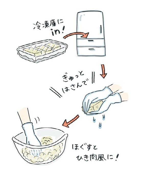 (4)1枚ずつ両手ではさむようにしてギュッと水気を絞る。絹ごしはくずれやすいので注意して。そぼろ肉風にする場合は、手でほぐせば完成!