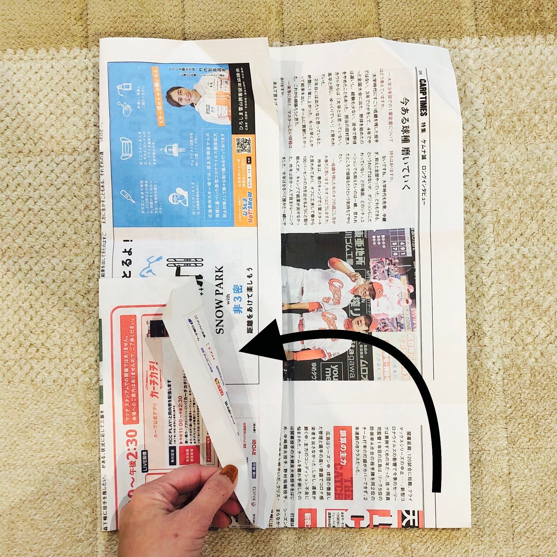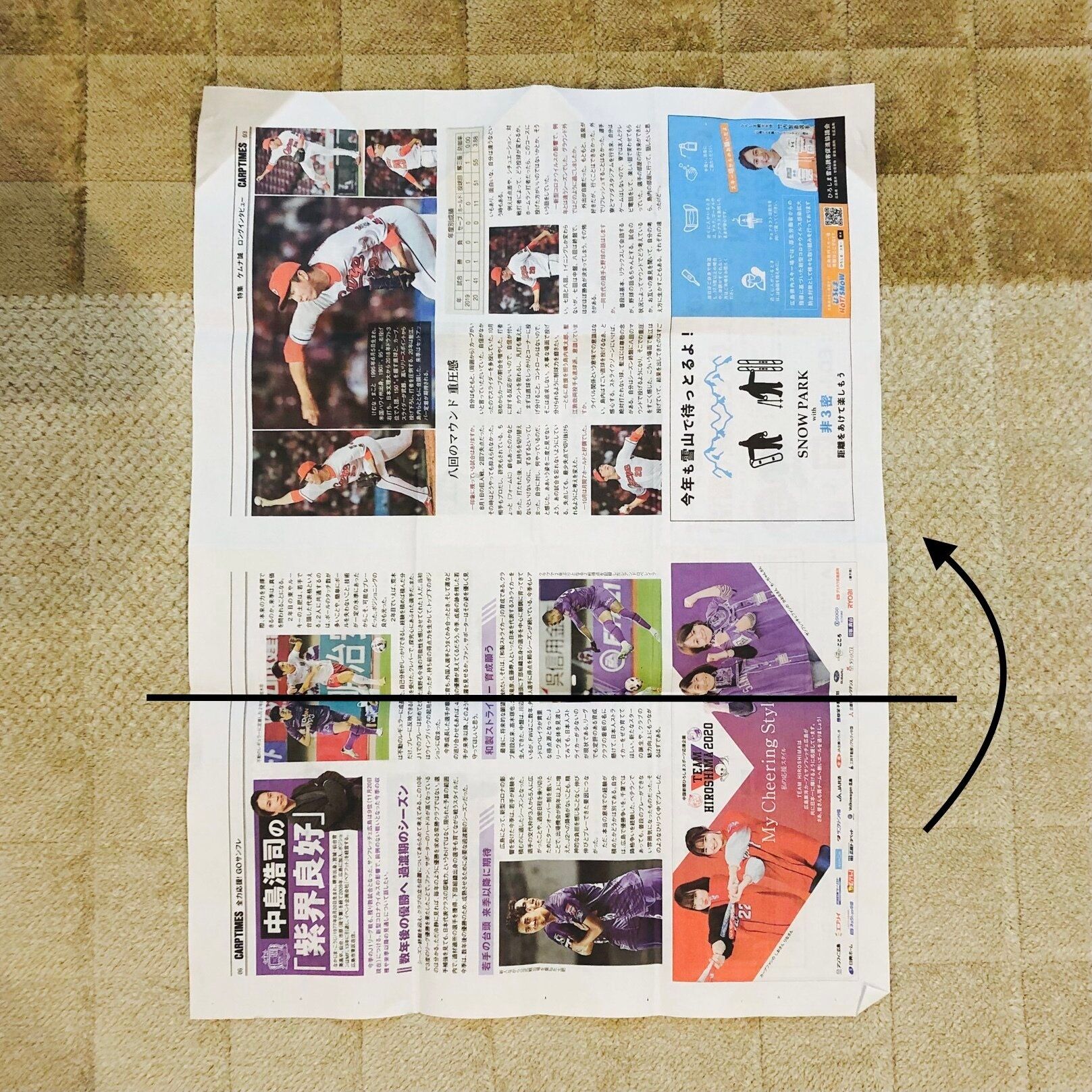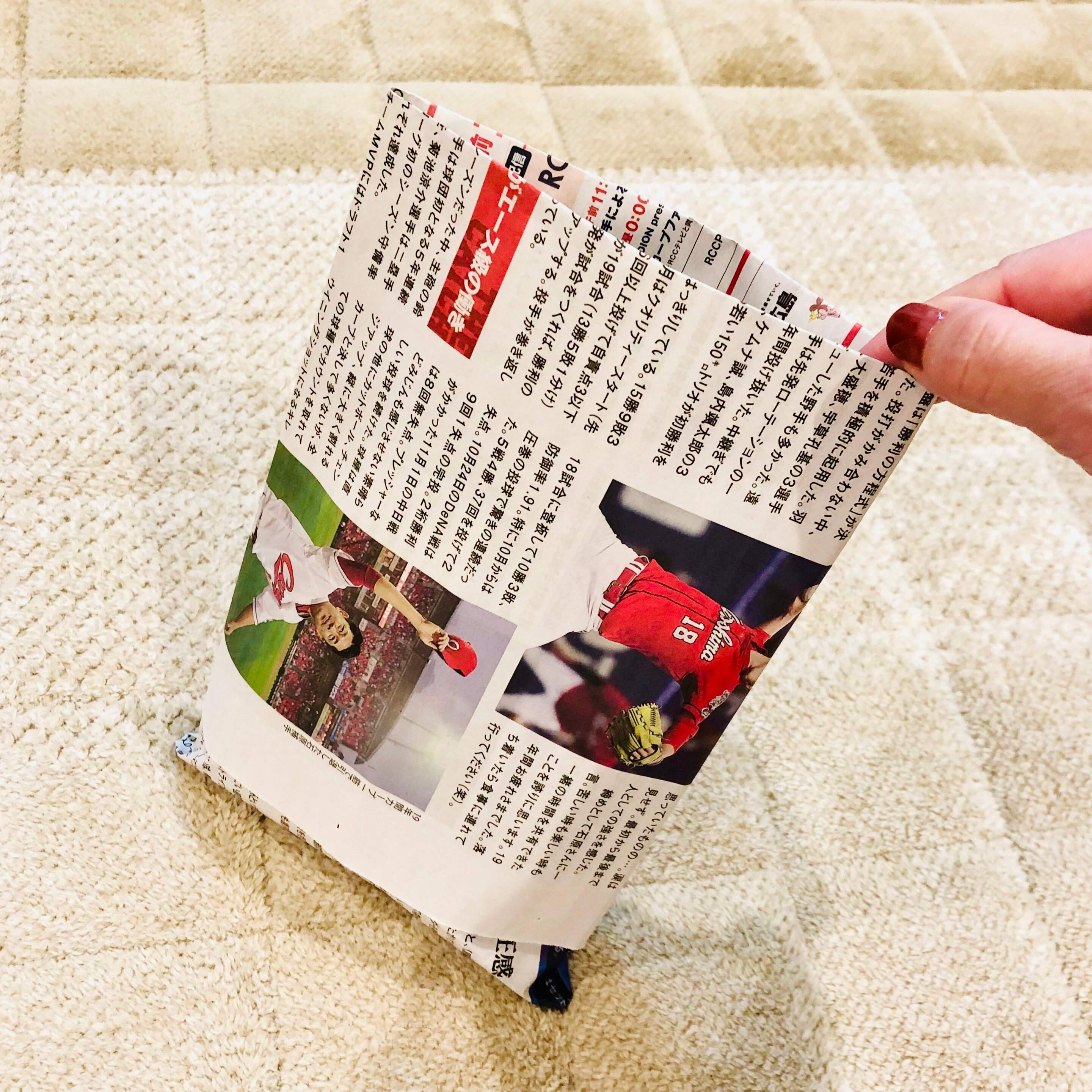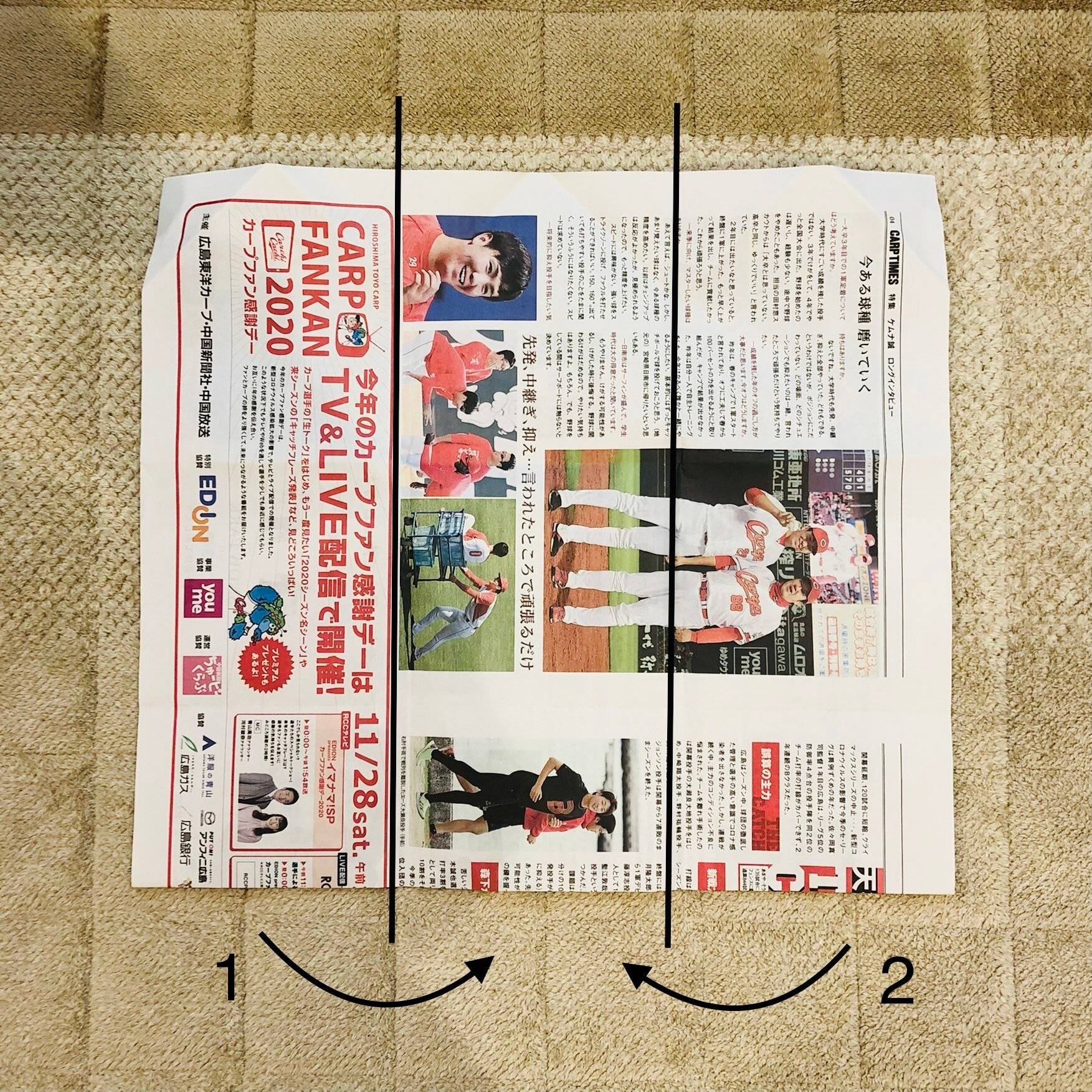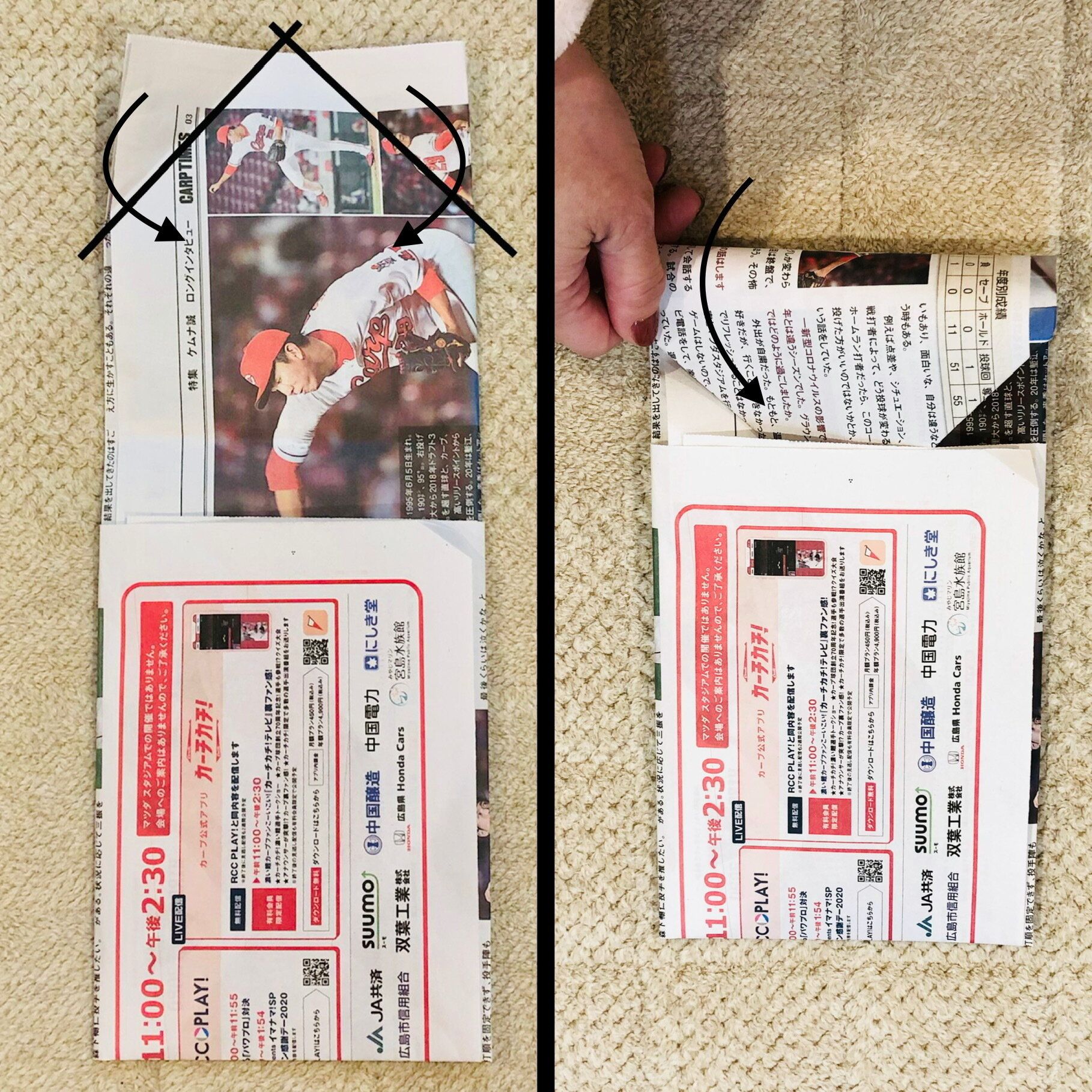 新聞紙を横向きにして折れば、安定感がアップするので、テーブルの上などに置いて使うのに便利です。