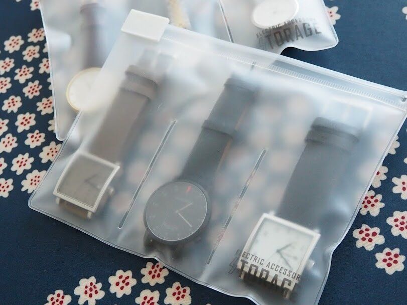 ポーチに仕切りが入っているので、小物類を3つに分けて収納できるようになっています。我が家では腕時計収納に使っています。