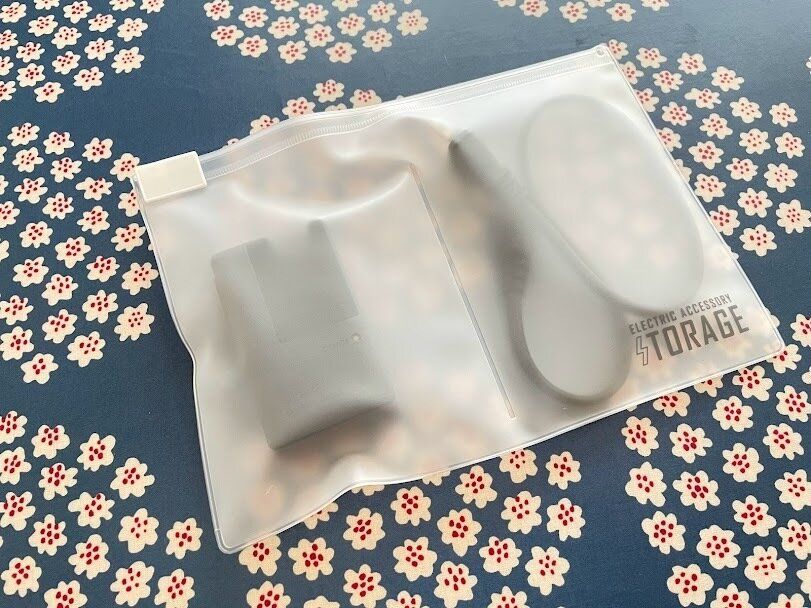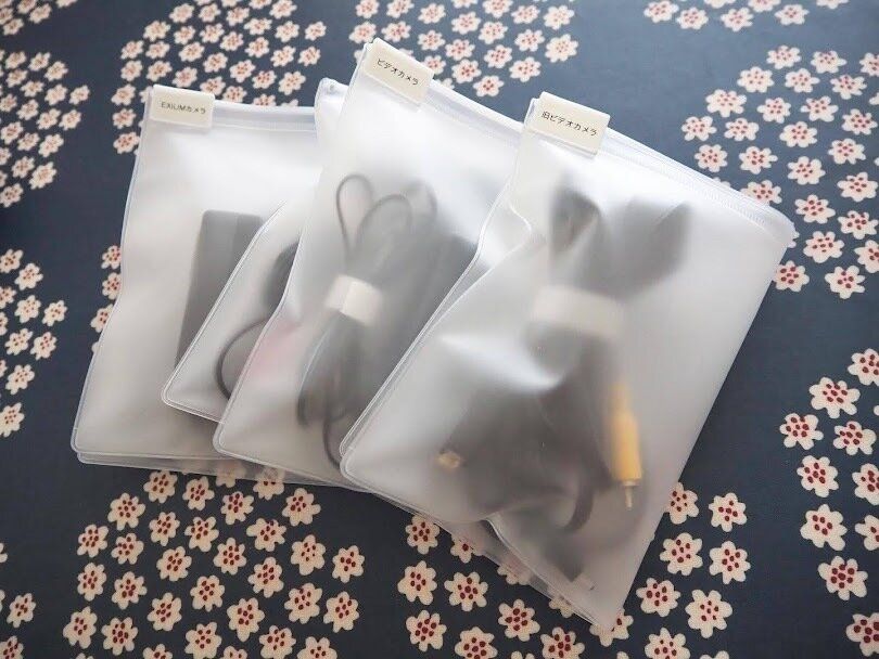 デジカメとビデオカメラのケーブルはよく似ているので、しっかり把握しておかないと迷ってしまいがちですが、ポーチごとに分けてスライダー部分にラベリングしておくと、把握しやすいですよ。