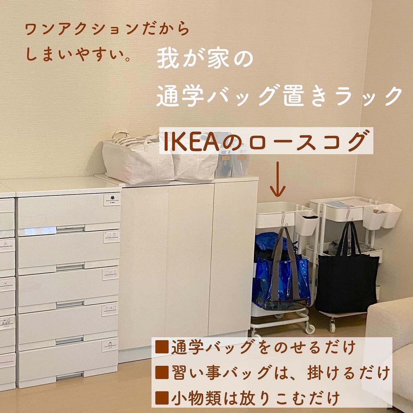 お子さんの着替えや準備、子どもの物は子ども部屋にあるべき!と思いがちですよね。しかし、家族が長くいるリビングに着替え、子どもの学校の物などまとめて置くと子どもが自分で準備出来ます。